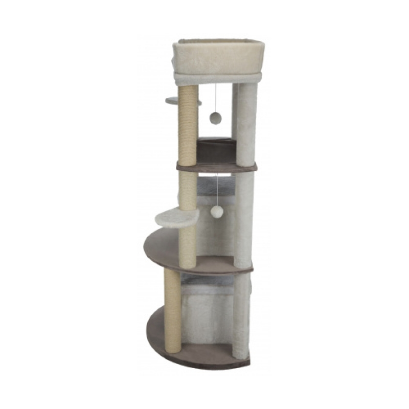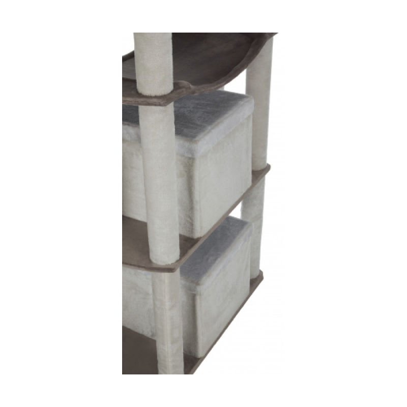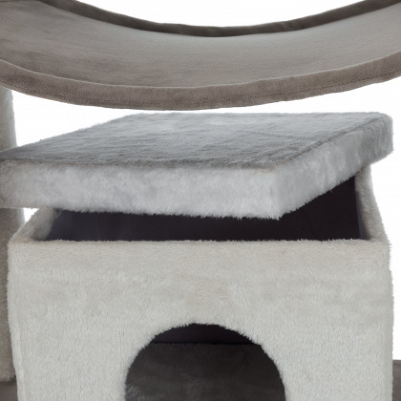 Floor area: 78 × 58 cm Post: ø 9 cm Height: 158 cm with plush cover/short-hair plush cover posts wrapped in jute/plush cave fitted with plush/fleece platform with removable cuddly bed cuddly bed with reversible cushion: washable by hand with toys on string colour: white/cappuccino