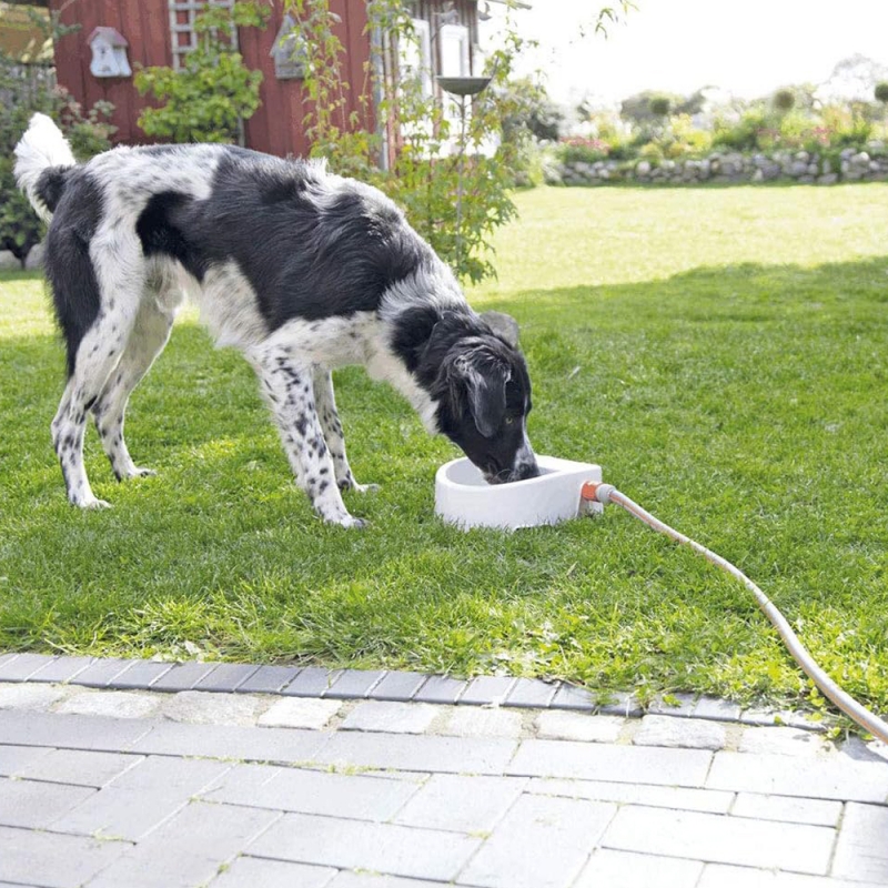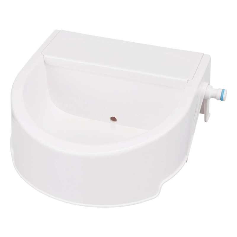 Measurements: 1.5 l/24 × 10 × 23 cm Colour: white for dogs, cats and small livestock floating valve regulates automatic refilling hose connector (ø 13 mm) with quick coupling (1/2") from the right for standing or wall mounting (mounting material not included) for cleaning simply wipe out the trough no need for electricity or batteries plastic