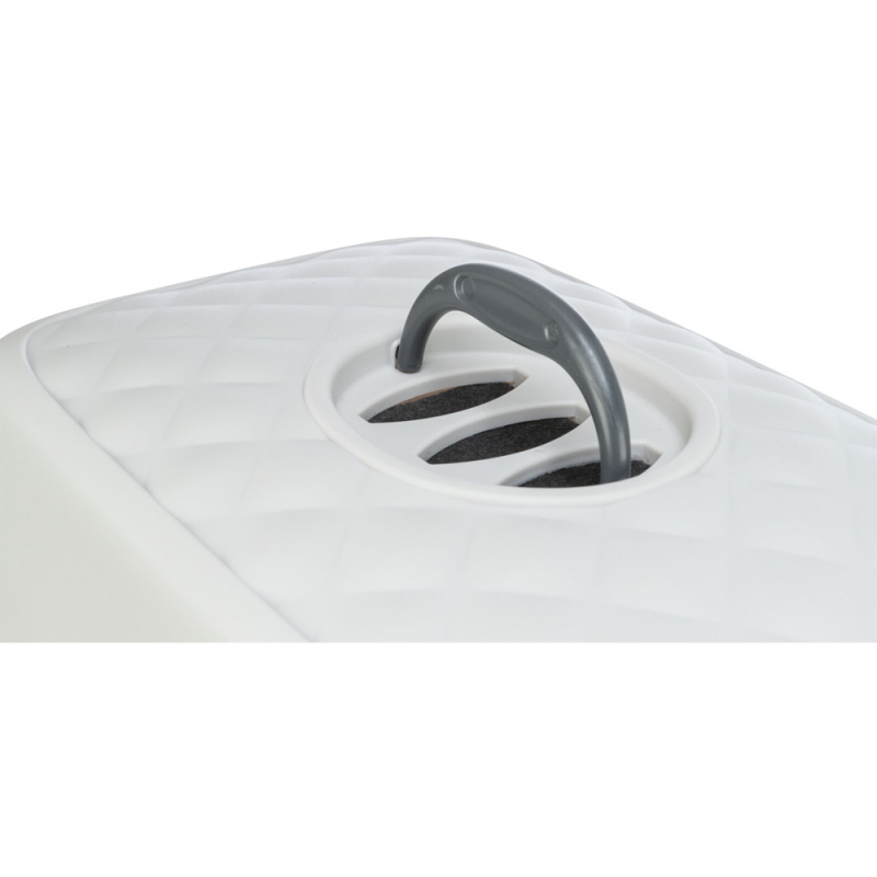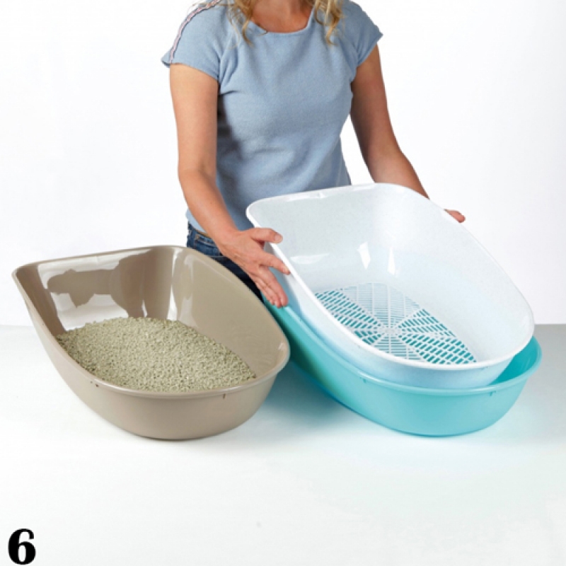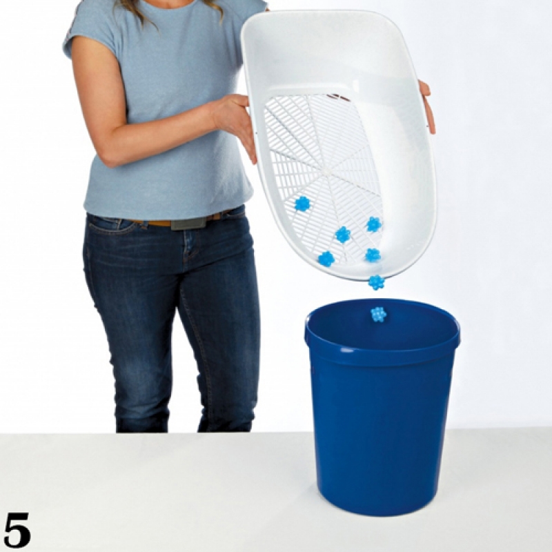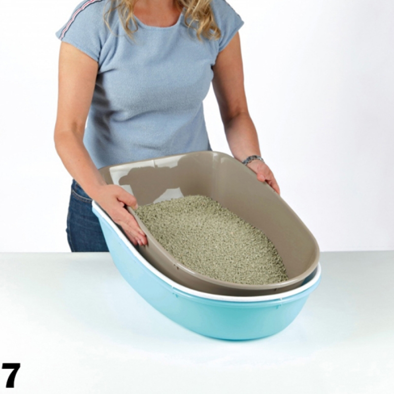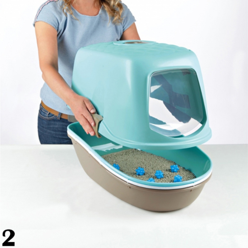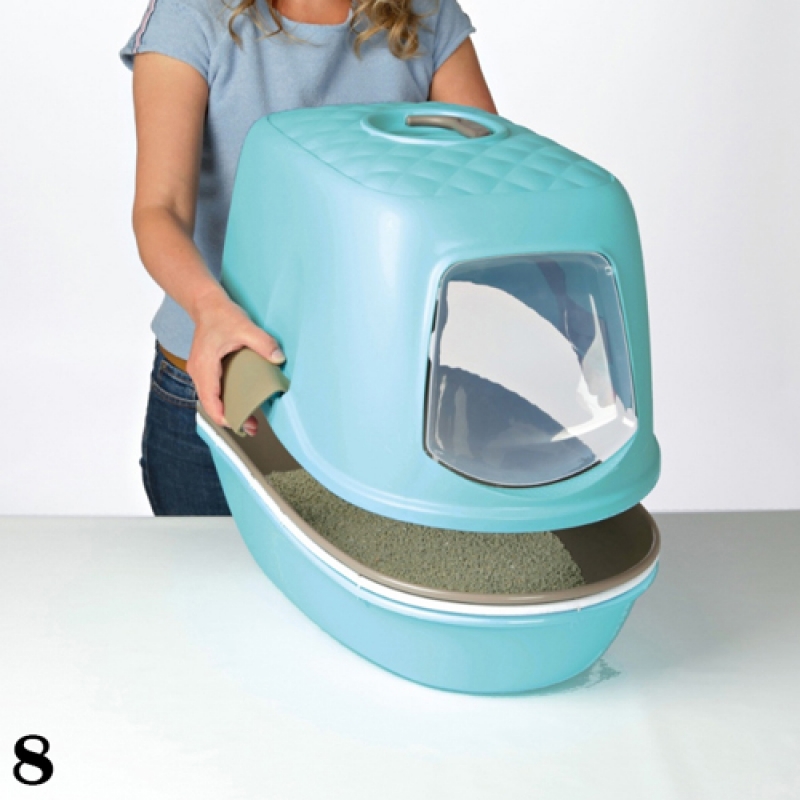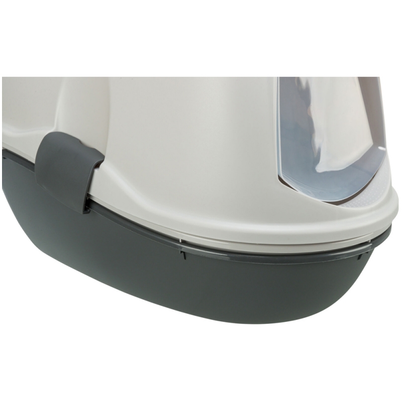 with hood, door flap and handle activated carbon filter neutralises bad odours 2 trays and 1 sieve make it quick and easy to clean Easy Click clasps make it fast to open and close hygienic separate waste system low litter consumption Measurements: 39 × 42 × 59 cm