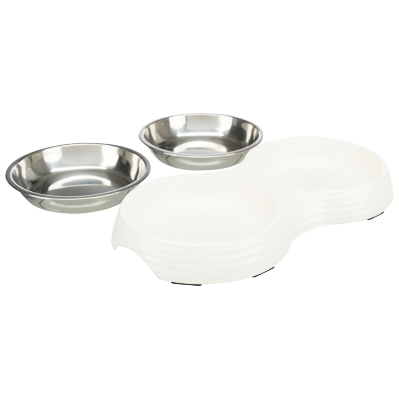 shallow version 2 stainless steel bowls with stand Bowl Holder made of melamine non-slip due to rubber feet Measurements: 2 × 0.2 l/ø 13 cm/27 × 3 × 14 cm Colour: white Contents: 2 pcs.
