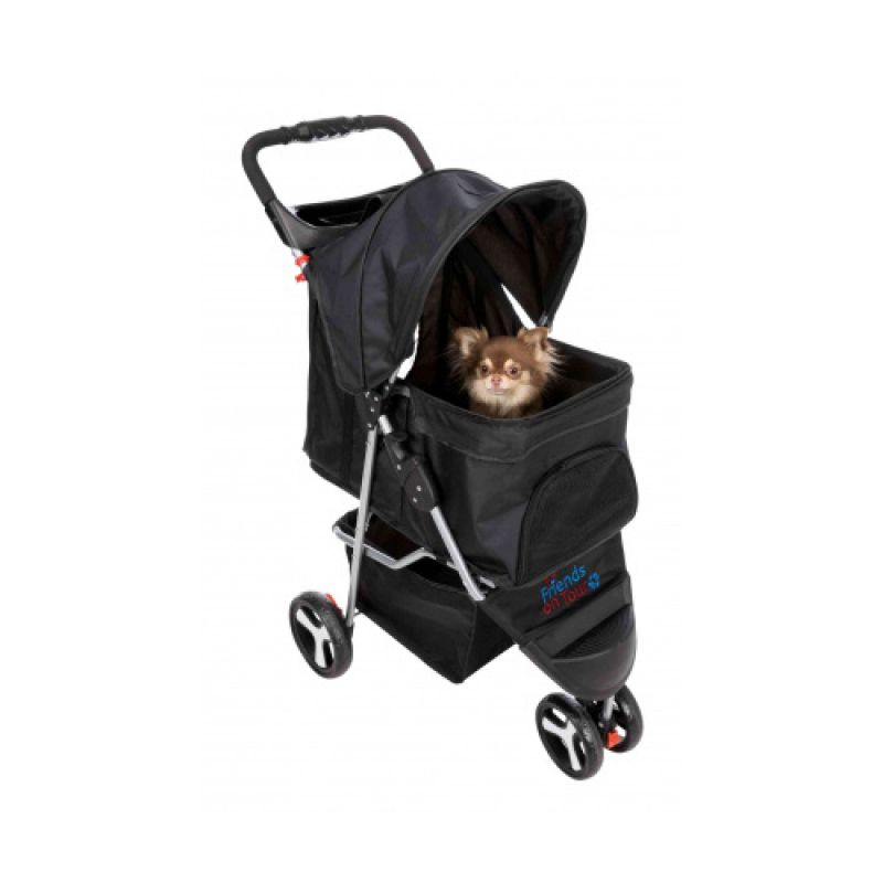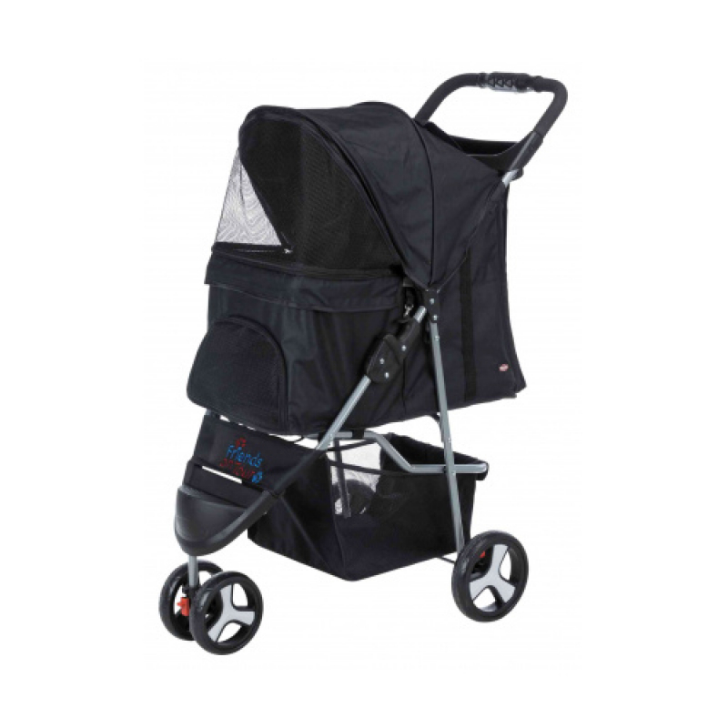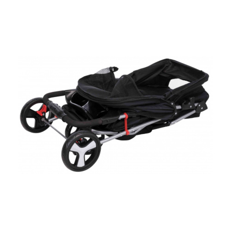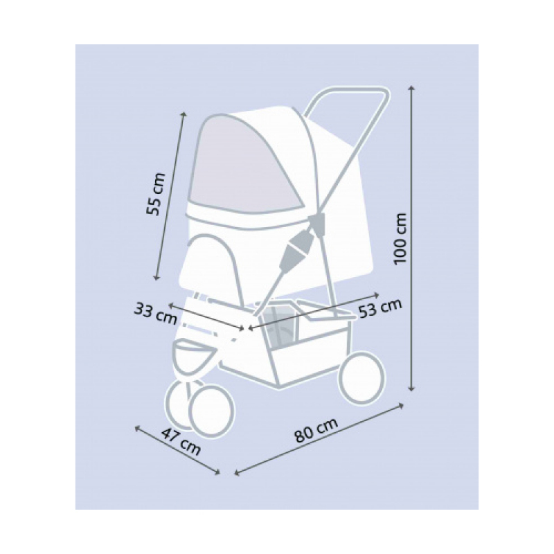 Measurements: 47 × 100 × 80 cm Weight: 5.1 kg up to: 15 kg Height: 100 cm polyester, metal, powder-coated (rust-free) extra light-weight version (4.6 kg) for old, sick, timid or very young dogs and cats sheltered retreat option in busy places one-hand folding system on handle smooth-running thanks to low empty weight and swivel front wheels, with suspension with 2 parking brakes large openings for getting in and out or for lifting in a pet various tear- and bite-proof net inserts for fresh air and a good view, some can be covered can be partly or fully closed with zips 2 short leashes prevent the pet from jumping out removable cushion, removable cover with padded handle, cup holder and storage basket cabin size: 33 × 55 × 53 cm dimensions folded: 47 × 29 × 84 cm