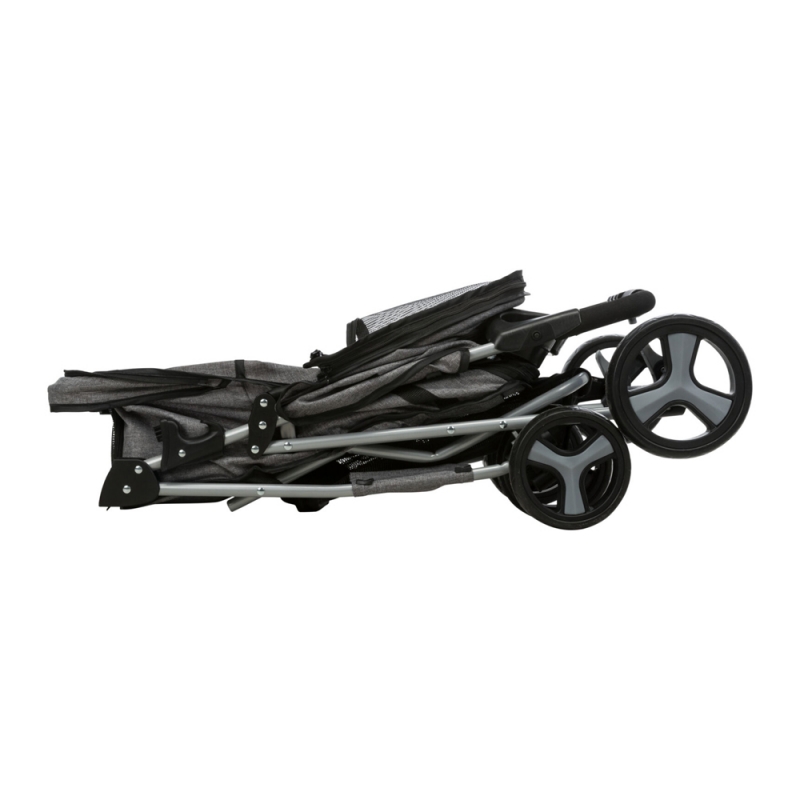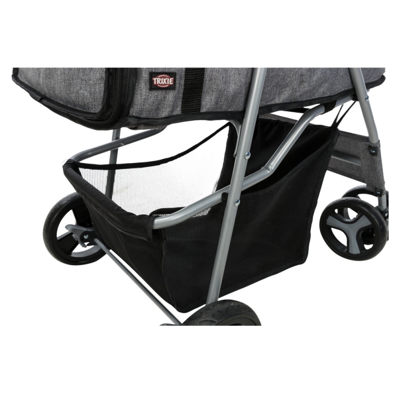 Measurements: 47 × 100 × 80 cm Product Weight: 4.9 kg up to: 15 kg Internal dimensions: 33 × 53 × 55 cm with 4 wheels for more stability with quick-fold function for old, sick, timid or very young dogs and cats one-hand folding system on handle front wheel with 360° joint, spring-mounted with 2 parking brakes large rear door for getting the pet in and out can be partly or fully closed with zips various net inserts, some can be covered with 2 short leashes removable cushion (polyester), removable cover with padded handle, storage compartments and basket metal, polyester cover