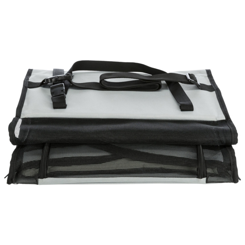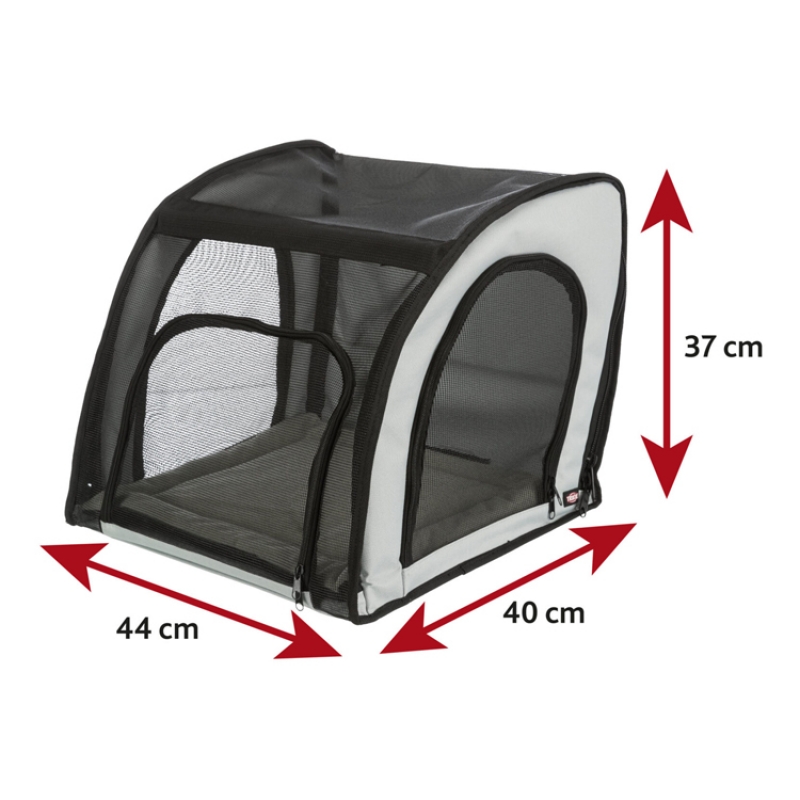 Measurements: 44 × 37 × 40 cm Colour: grey/black can be opened at the front and side with straps to fix the box inside the car belt slit makes it possible to buckle the dog up various net inserts removable cushion with foam padding: washable by hand collapsible polyester