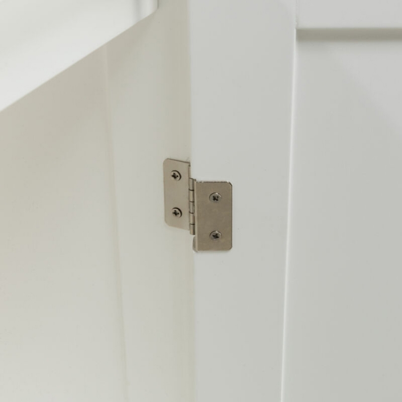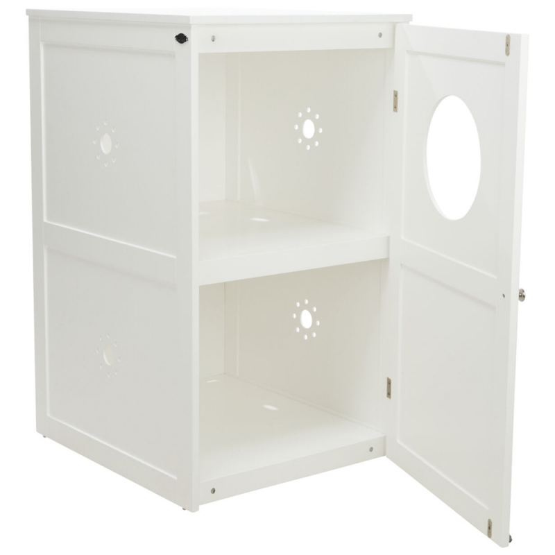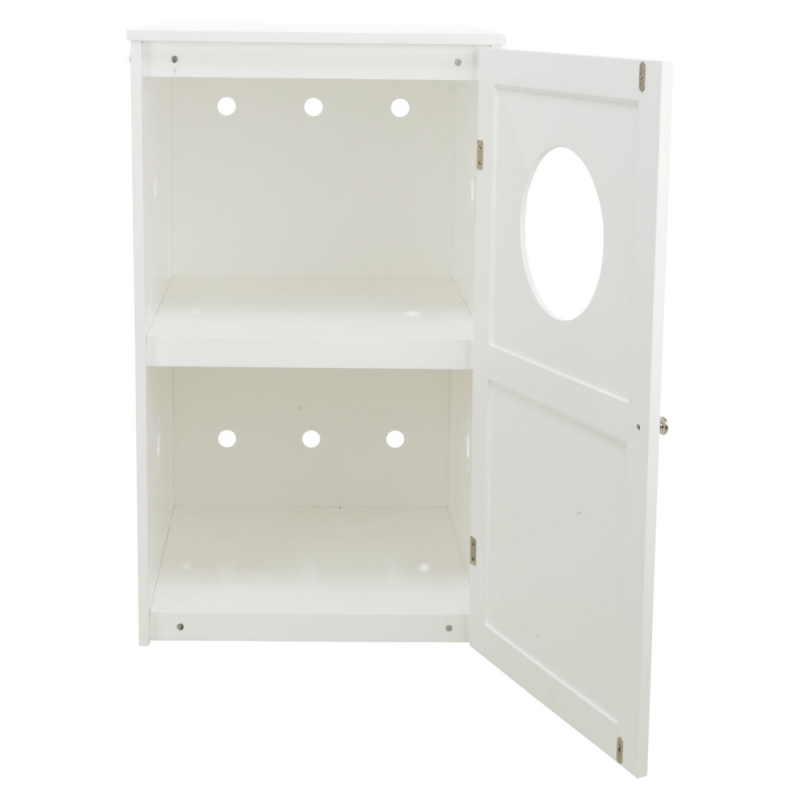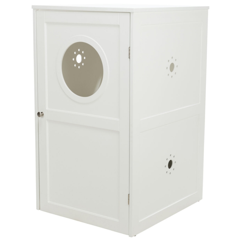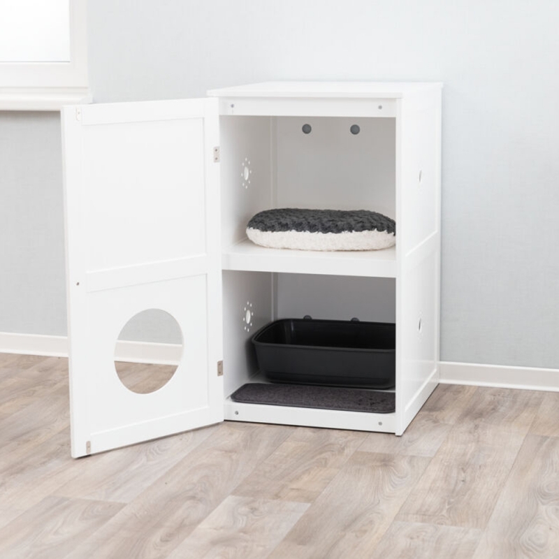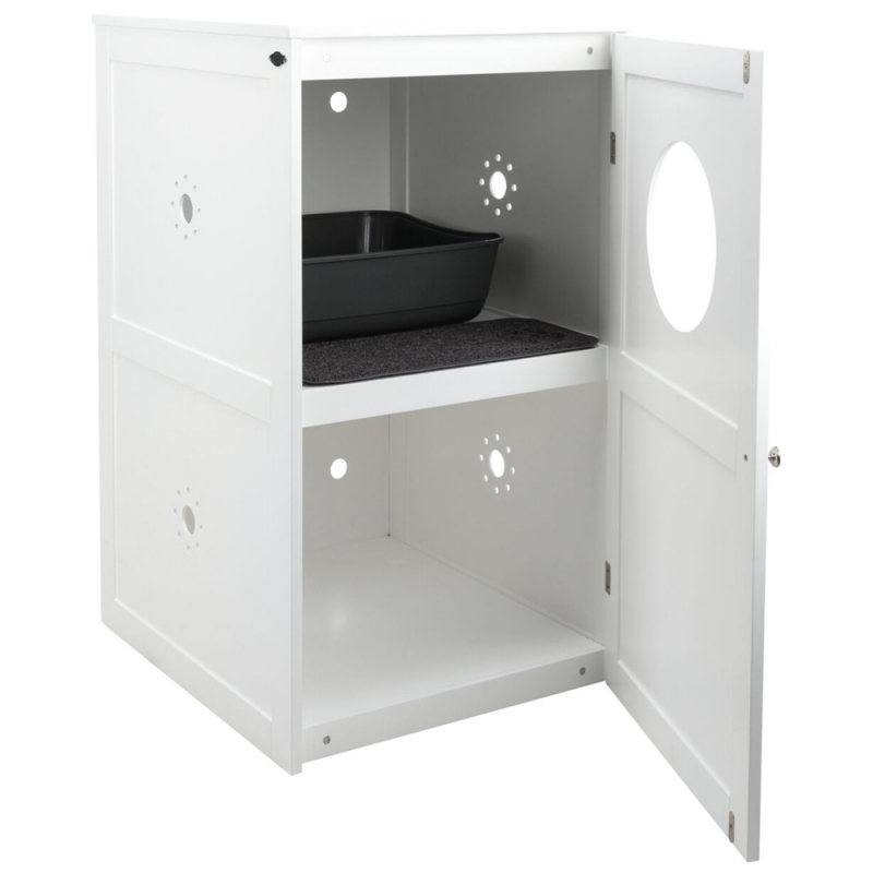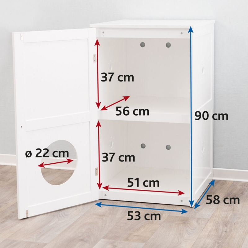 Measurements: 53 × 90 × 58 cm Colour: white MDF, varnished for hiding a cat litter box prevents cat litter being spread with cat litter mat can also be used as sleeping quarters free level can be used as storage space for litter and utensils having the entrance hole at the top makes cleaning the cat litter tray in the upper level easier entrance hole can be placed either at the top or at the bottom the entrance can be installed either on the right or on the left door with magnetic closure fits cat litter mats