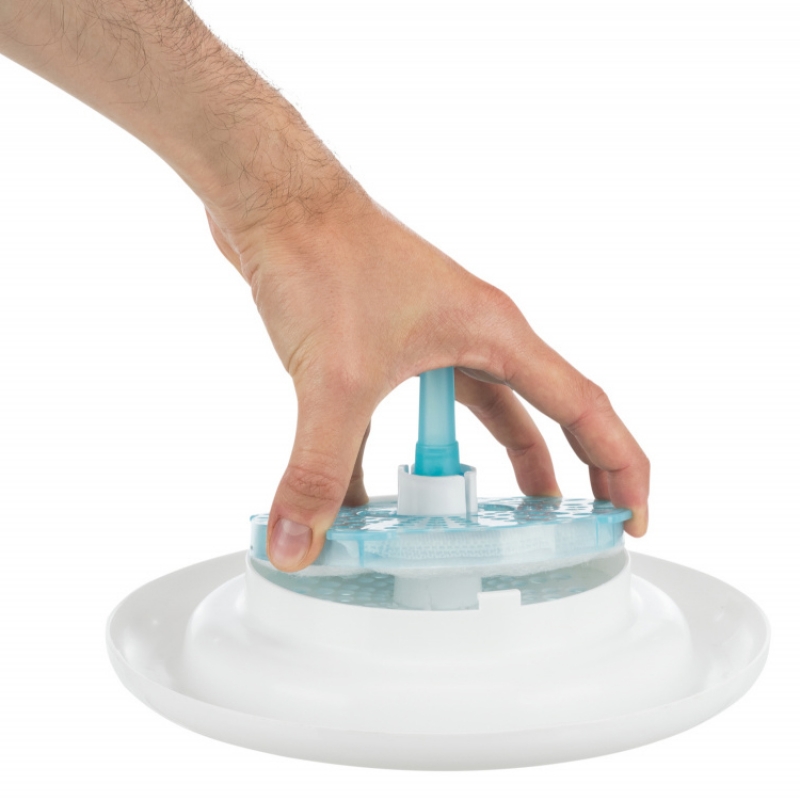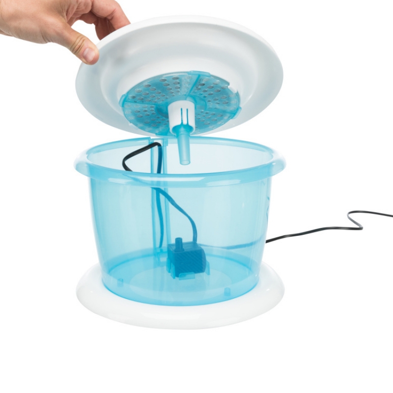 Measurements: 3 l Colour: blue/white plastic fresh gently bubbling water motivates the pet to drink reduces bad smells and provides optimal taste enriches the water with oxygen cold water through circulation active carbon filter ensures an improved water quality (incl. 2 replacement filters) transparent tank for content checks quiet and adjustable pump low power consumption