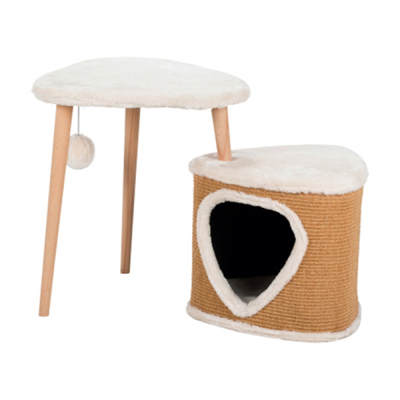 with plush cover, sisal scratching surface and beechwood feet cave fitted with plush/fleece with reversible cushion: washable by hand padded platform with removable plush cover: washable by hand with toy on string colour: beige/brown Measurements: 70 × 53 × 46 cm