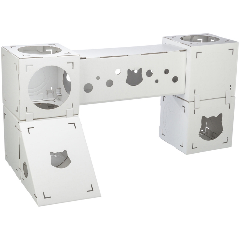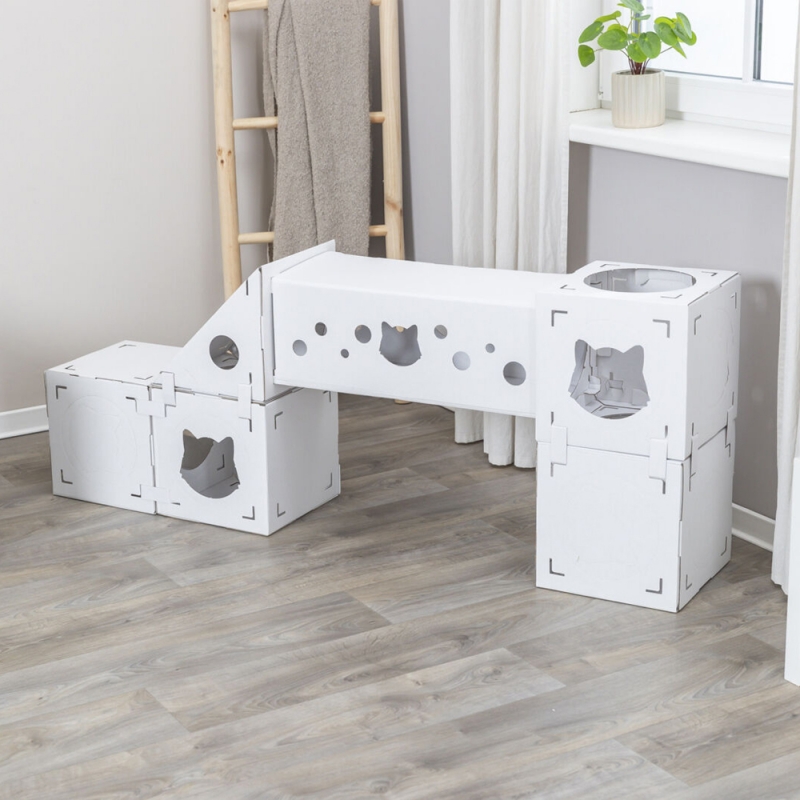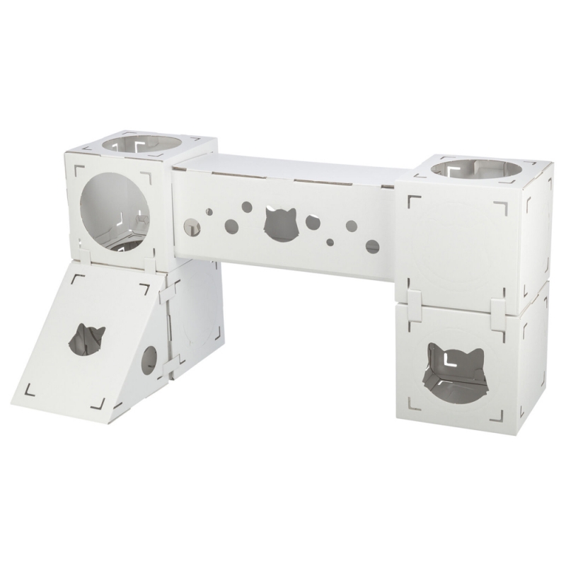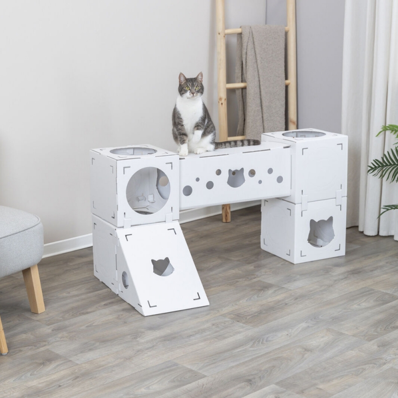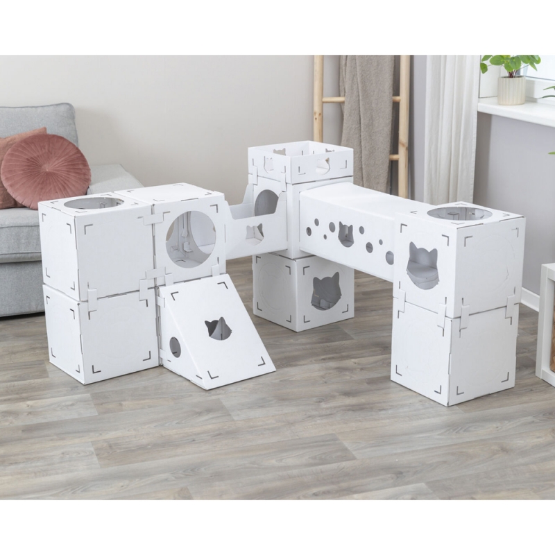 Measurements: 125 × 62 × 62 cm Flexible & creating variety suitable for cats up to 8 kg set includes: 4 cubes, 1 tunnel, 1 ramp made of 100 % recycled cardboard All our cat tree models have various scratching surfaces made of sisal or jute. Sisal and jute are particularly suitable for claw care, as these materials are sufficiently rough to remove the worn down layers of claws. They love to sharpen their claws on suitable surfaces. It is also important to groom their claws so that they can shed the worn-down sheaths of the claws, exposing the constantly regrooming claws.