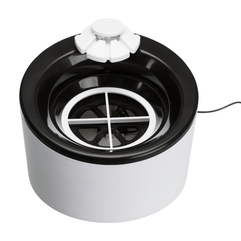 Measurements: 2 l/ø 22 × 18 cm Height: 18 cm Colour: black/white flowing water or still water can be drunk from the bowl water inflow can be regulated enriches the water with oxygen cold water through circulation active carbon filter ensures an improved water quality pump with automatic stop, exchangeable