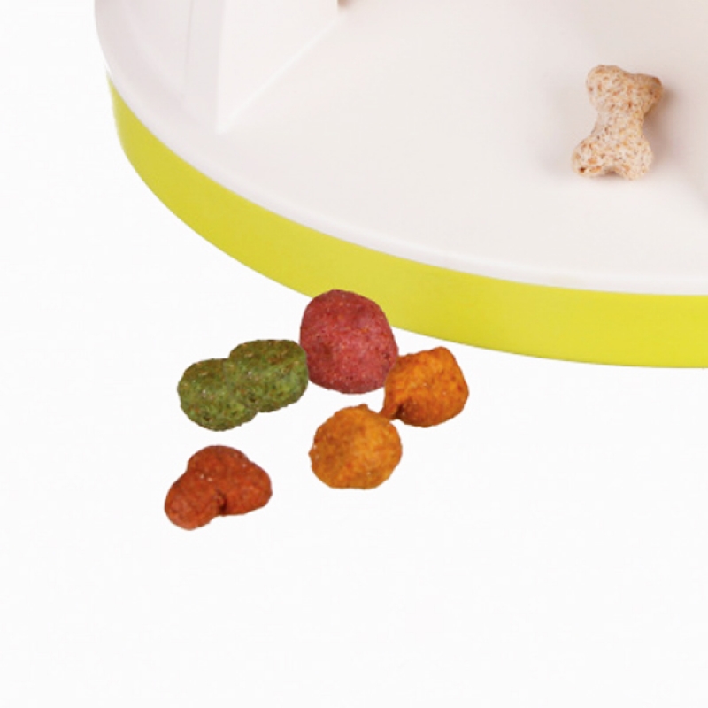 for dogs and cats for regular activity with 5 compartments that can be filled with small toys or treats compartment opens after the set time together with a signal tone and the surprise falls out can be set to 2 intervals (30 or 60 minutes) plastic non-slip due to rubber feet battery-operated (3 AA mignon batteries not included) incl. booklet with tips and tricks for designing optimal training