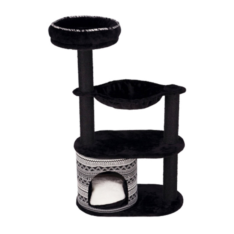 Floor area: 65 × 38 cm Post: ø 9 cm Height: 112 cm with plush cover posts wrapped in natural sisal cave made of upholstery fabric with reversible cushion: washable by hand hammock with stable metal frame padded platform with removable cuddly bed cuddly bed: washable by hand colour: black/white