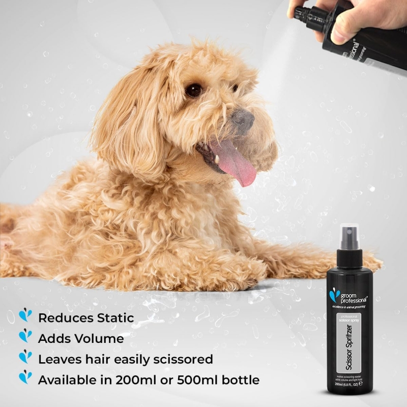 200 ml Reduces Static Holds and adds Volume Won't leave any residue Groom Professional Scissor Spirtzer is one of our most eagerly awaited products. During trails every one of the groomers and exhibitors who received a sample, all rated the product as excellent. If you use scissors then Scissor Spritzer is a must to reduce static, leave the hair easier scissored, as well as the comb gliding easily through the coat. Scissor Spritzer holds and adds volume the coat without making it sticky or leaving any residue. Simply spray on and comb in before scissoring to leave a beautiful finish.