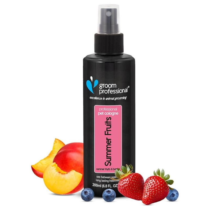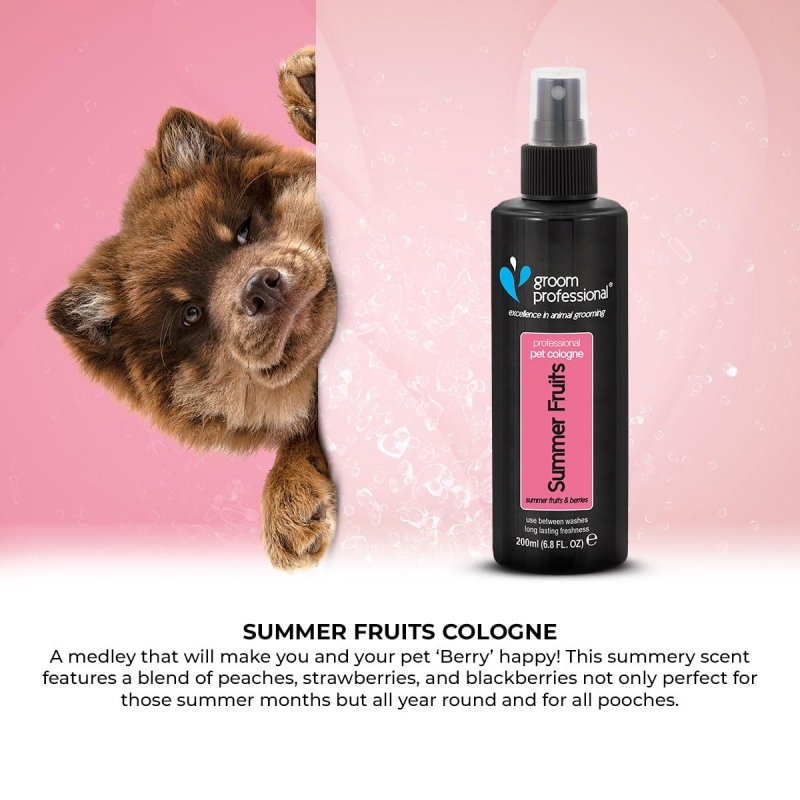 500 ml This gorgeous, Summer Fruit scented cologne will bring back memories of fun in the sun! This fragrance opens with top notes of blackberry, blackcurrant, bergamot and green fruits, resting on a heart of soft plum, creamy peach, strawberry and violet. All resting on a base of ripe raspberry. Suitable for male and female dogs and cats. Scent will last for days.