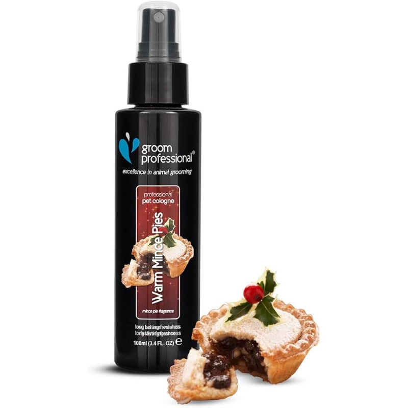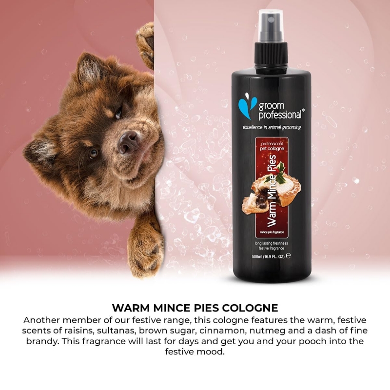 500 ml A true festive scent for your pet and clients! Features the warm, festive scents of raisins, sultanas, brown sugar, cinnamon, nutmeg and a dash of fine brandy. Simply spray onto a dry coat between baths for instant freshness - or use after the Warm Mince Pies Shampoo for a super-seasonal treat! Scent will last on the coat for days. To Use: Simply spray once or twice on the back of the neck to leave the dog & cat smelling great for days.