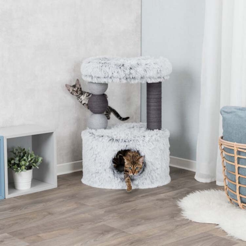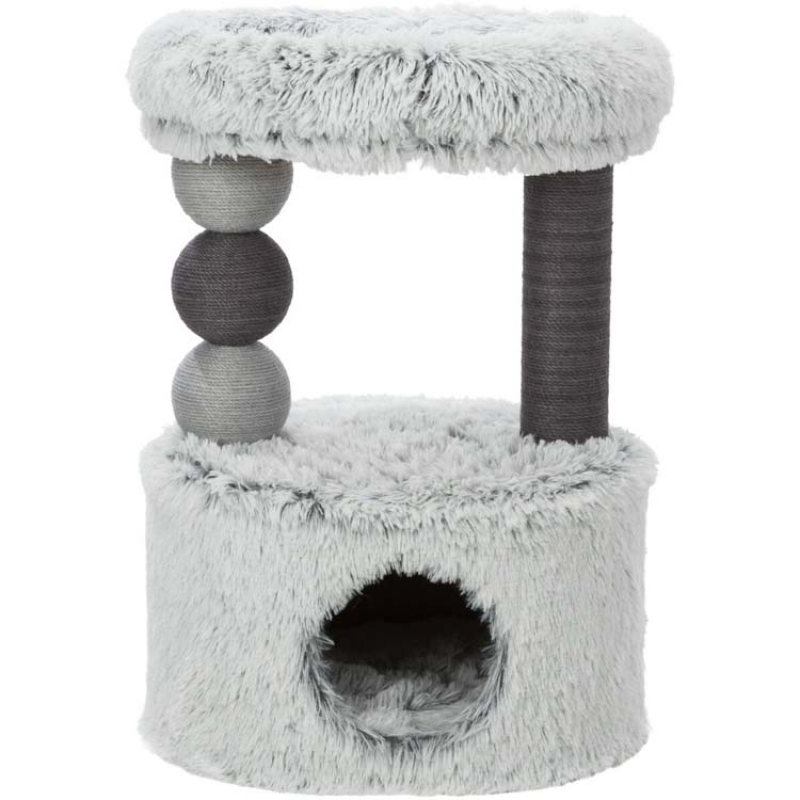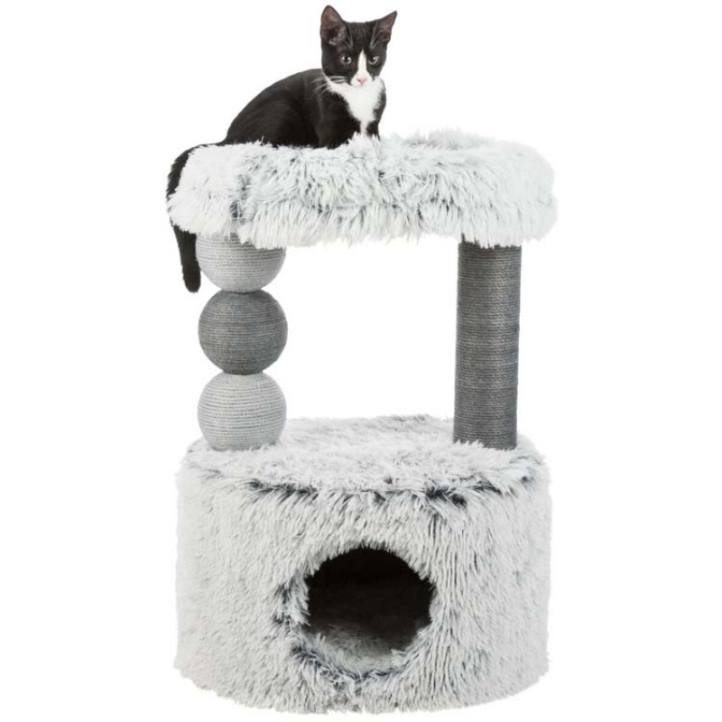 Measurements: 73 cm Floor area: 54 × 40 cm Post: ø 9 cm Height: 73 cm colour: white-black jute/long-haired plush (polyester) cuddly bed with padded rim cave fitted with fleece (polyester) and reversible cushion (hand wash)