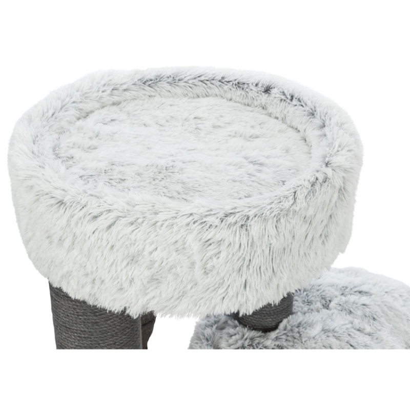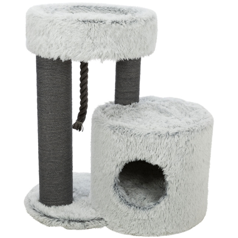 Floor area: 86 × 54 cm Post: ø 15 cm Colour: grey Height: 96 cm Especially suitable for large cats jute: ø 6 mm/plush (polyester) cave fitted with fleece (polyester) cuddly bed with padded rim 3 reversible cushions: washable by hand thick, heavy base plate colour: grey