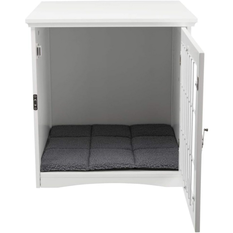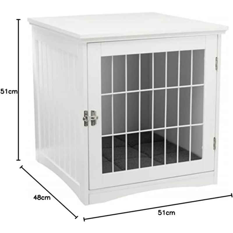 Measurements: 48 × 51 × 51 cm Height: 51 cm Colour: white ideal for short-term placing at home offers a retreat option opens from the front with metal grid and latch cuddly insert in lamb fur look (polyester) with foam filling and non-slip bottom, hand wash simply wipe clean MDF, varnished