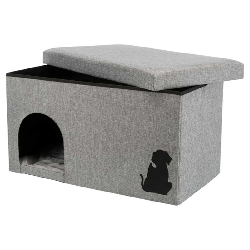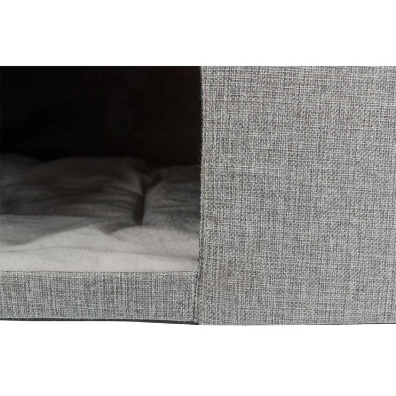 Measurements: 72 × 40 × 40 cm Height: 40 cm Colour: light grey with storage compartment woven fabric (polyester) for small dogs and for large cats collapsible with removable, padded lid and storage compartment cave can be completely opened from above thanks to hook and loop fasteners at base of storage compartment reversible cushion with plush cover (polyester): machine wash 40 °C gentle