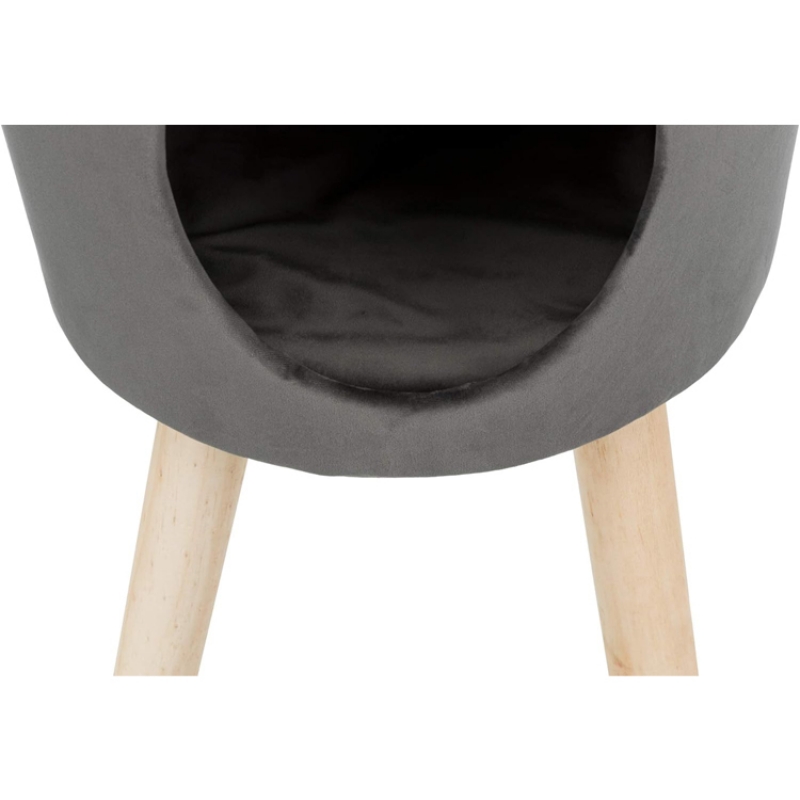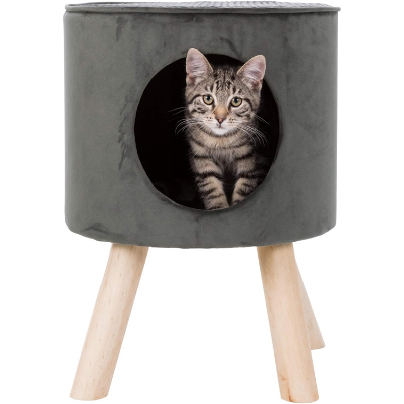 Measurements: ø 38 × 50 cm Height: 50 cm Colour: dark grey velvet look polyester cover with place on the roof for observation padded platform reversible cushion with two design versions and polyester fleece filling, washable by hand with wooden feet up to 40 kg
