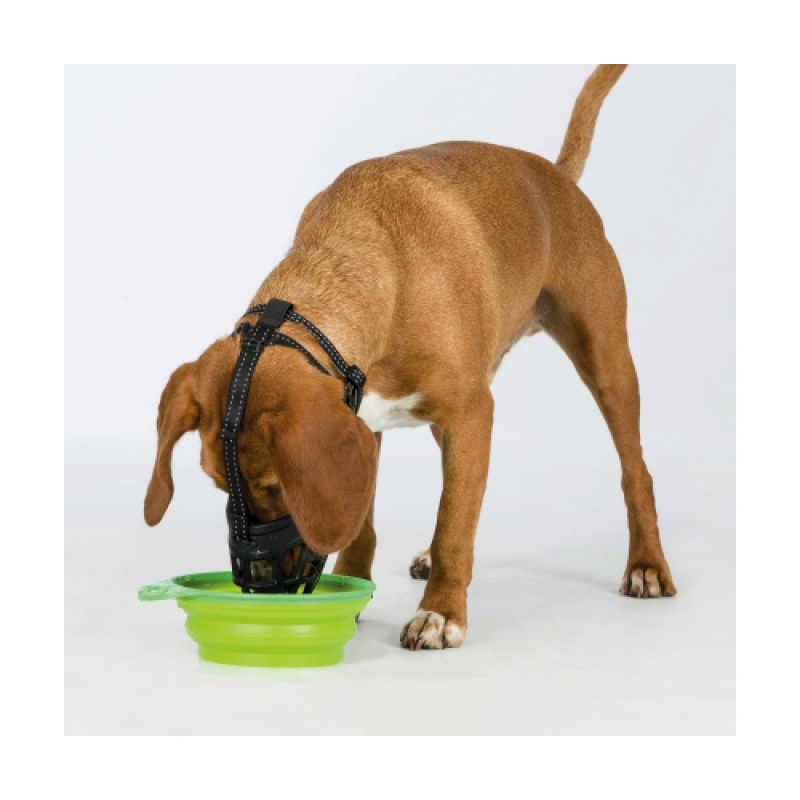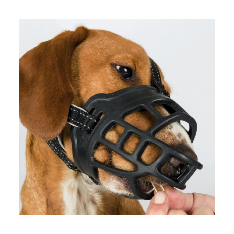 Size: S, M, M-L, L, XL, L-XL silicone/nylon/neoprene prevents biting no problems with panting, drinking and feeding treats particularly comfortable to wear due to ergonomic fit, flexible silicone that is stable in shape and neoprene-padded straps in face and neck areas secure due to threefold fastening continuously adjustable forehead strap and neck strap as well as nape loop with reflective stripes colour: black