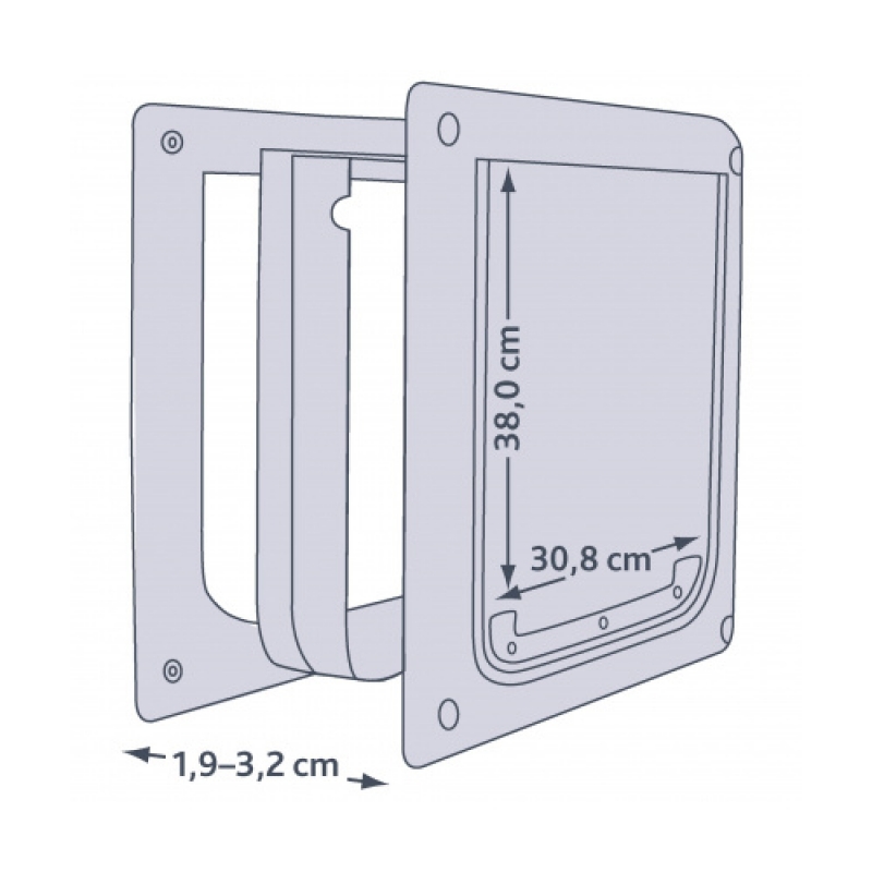 Colour: white for dogs (size M–XL) plastic flexible transparent flap, silent action sturdy metal bar at lower end of flap lockable with removable metal rear panel which protects against intruders and against wind and bad weather incl. tunnel element depth 19–32 mm can be extended by tunnel elements total measurements 39 × 45 cm cut out size 33 × 40 cm flap size 30.8 × 38 cm 3 years guarantee
