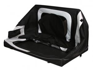 Small / Measurements: 61 × 43 × 46 cm / Height: 43 cm Small-Medium / Measurements: 76 × 48 × 51 cm / Height: 48 cm Medium-Large / Measurements: 91 × 58 × 61 cm / Height: 58 cm Large / Measurements: 99 × 65 × 71/61 cm / Height: 65 cm made of high quality polyester particularly stable due to a high quality metal framework can be opened on three sides with net inserts for good air circulation topmost netting can be covered up to protect the pet inside Velcro underneath the box prevents it from slipping removable apron protects bumper against scratching can also be used outdoors with bottom flaps and pegs with side pocket and bottle holder cuddly insert made of lambs fur look colour: black/grey
