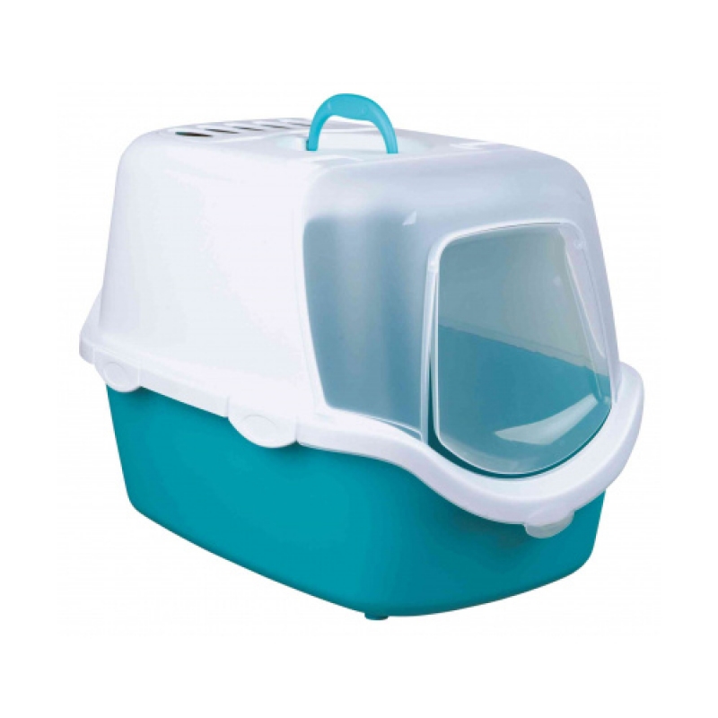 Measurements: 40 × 40 × 56 cm Height: 40 cm with hood, door flap, scoop and handle activated carbon filter neutralises bad odours hinged front for easy cleaning double rim prevents urine and litter being scattered out of the tray Easy Click clasps make it fast to open and close Color Measurements blue/white 40 × 40 × 56 cm