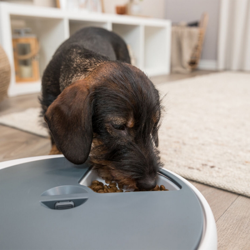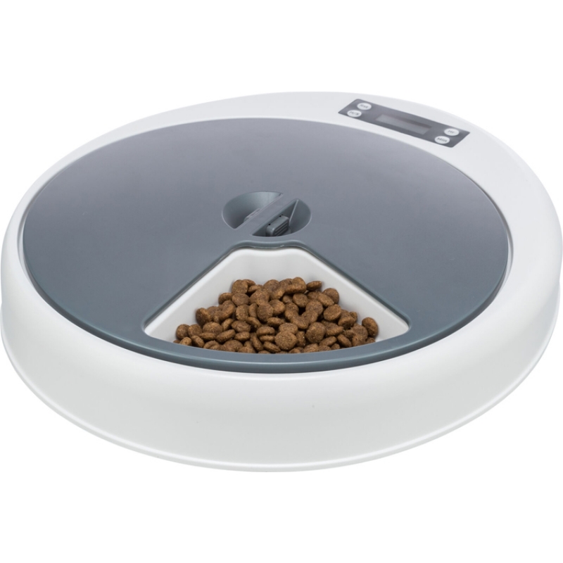 Measurements: 5 × 0.24 l/33 × 5 × 36 cm Colour: white/grey Feeding interval can be set (up to 4 meals per day) for 4+1 meals of 0.24 l also suitable for wet food feed bowls dishwasher proof battery-operated (4 AA mignon batteries not included) plastic