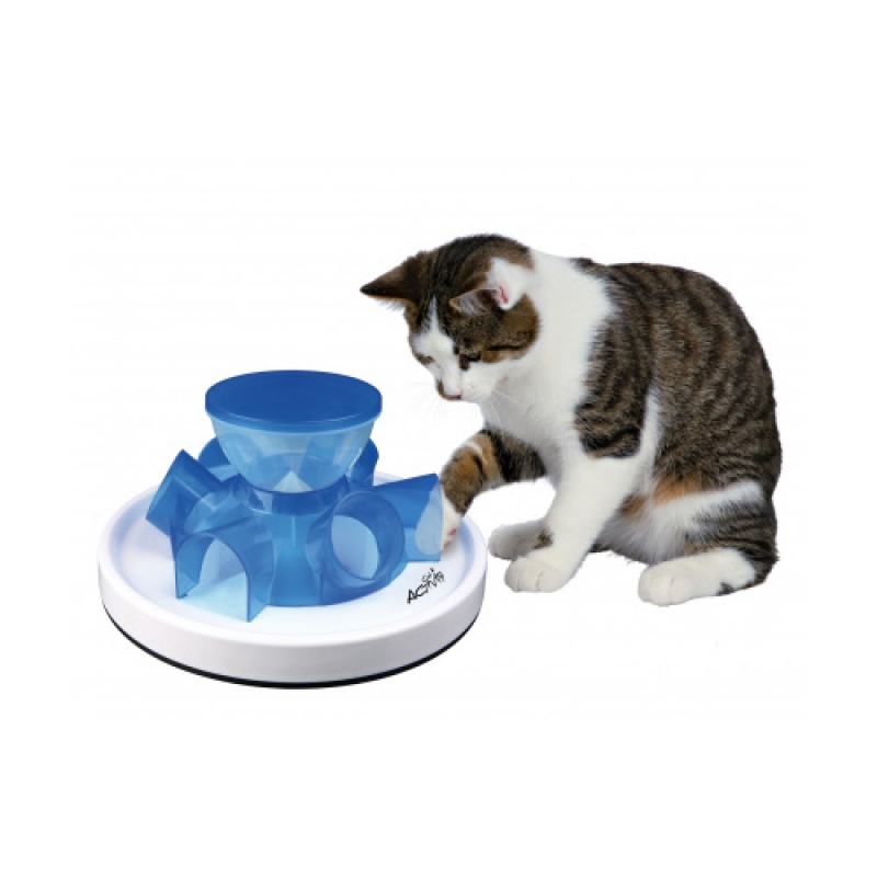 Measurements: ø 28 × 14 cm food falls from container into 6 different tubes adjustable output can also be used for daily feeding with dry food developed by cat expert Helena Dbalý physical exercise and mental stimulation trains the cat’s skills for cats from the age of 3 months up plastic non-slip due to rubber ring suitable for old or sick cats as well