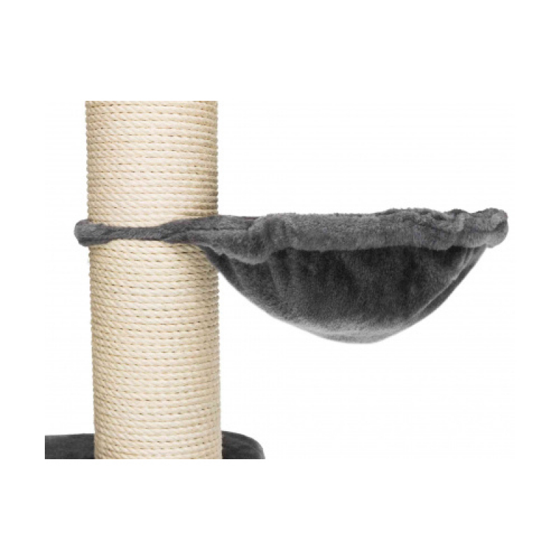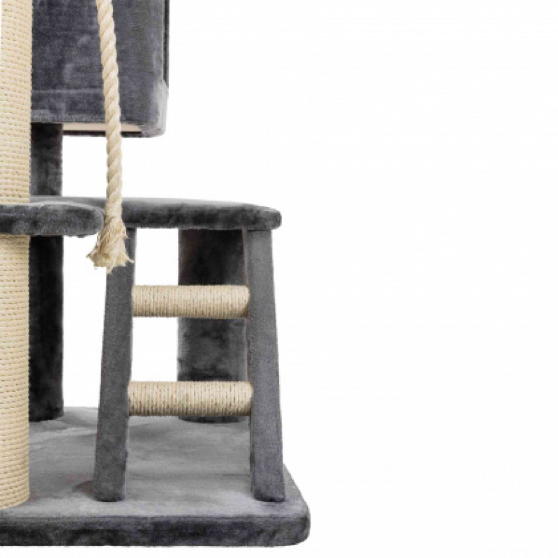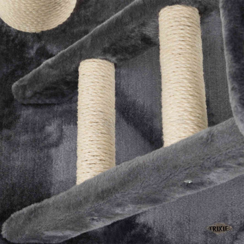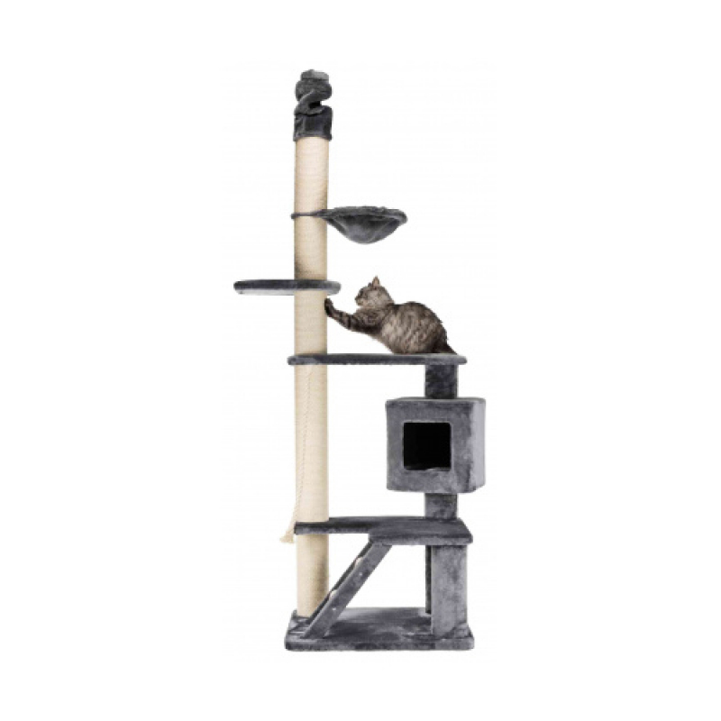 Floor area: 77 × 57 cm Post: ø 15 cm / Height: 220-240 cm High-quality Scratching Posts for large cats especially suitable for large cats with ceiling attachment with extra high-quality plush cover (polyester) posts wrapped in extra thick natural sisal and plush (polyester) padded platforms, durable cuddly bag and extra durable ladder cave fitted with plush/fleece (polyester) with reversible cushion: washable by hand thick, heavy base plate with play rope made of sisal