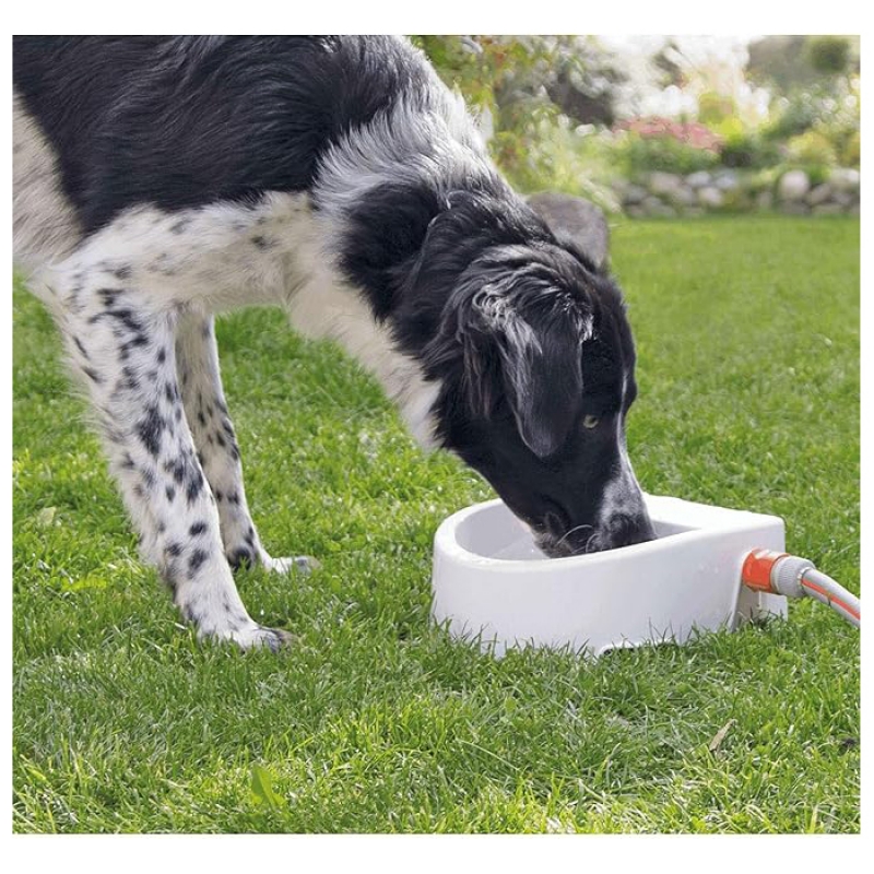 Measurements: 1.5 l/24 × 10 × 23 cm Colour: white for dogs, cats and small livestock floating valve regulates automatic refilling hose connector (ø 13 mm) with quick coupling (1/2") from the right for standing or wall mounting (mounting material not included) for cleaning simply wipe out the trough no need for electricity or batteries plastic