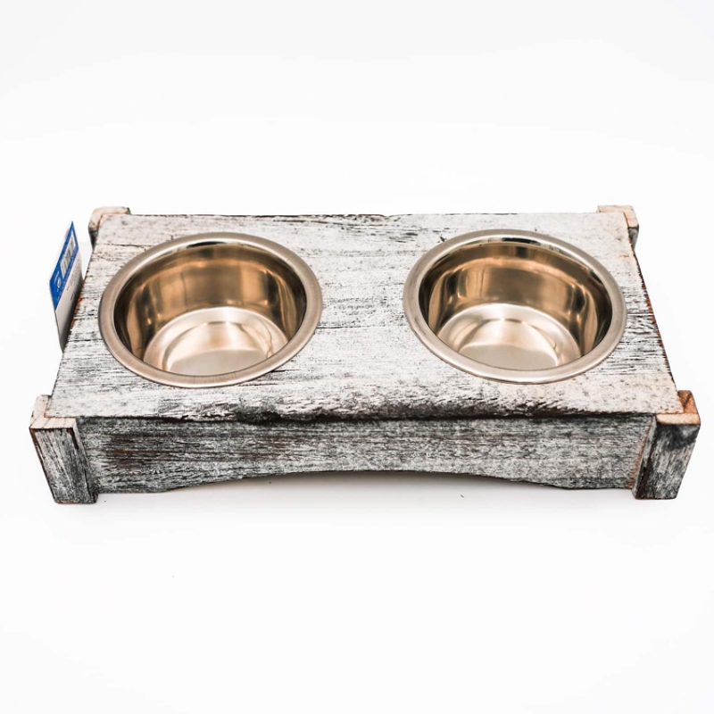 Measurements: 2 × 0.2 l/ø 10 cm/30 × 5 × 16 cm Measurements: 2 × 0.45 l/ø 12 cm/36 × 7 × 19 cm Measurements: 2 × 0.75 l/ø 15 cm/42 × 10 × 22 cm 2 stainless steel bowls with stand bowl holder made of varnished wood non-slip due to rubber feet