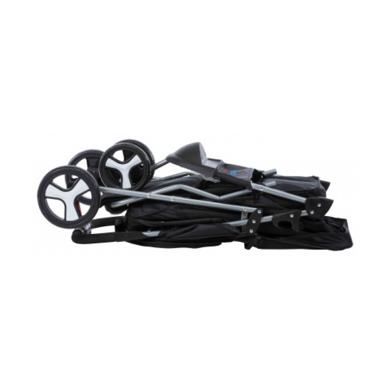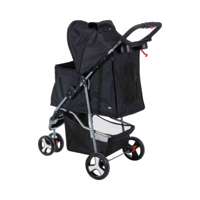 Measurements: 47 × 100 × 80 cm Weight: 5.1 kg up to: 15 kg Height: 100 cm polyester, metal, powder-coated (rust-free) extra light-weight version (4.6 kg) for old, sick, timid or very young dogs and cats sheltered retreat option in busy places one-hand folding system on handle smooth-running thanks to low empty weight and swivel front wheels, with suspension with 2 parking brakes large openings for getting in and out or for lifting in a pet various tear- and bite-proof net inserts for fresh air and a good view, some can be covered can be partly or fully closed with zips 2 short leashes prevent the pet from jumping out removable cushion, removable cover with padded handle, cup holder and storage basket cabin size: 33 × 55 × 53 cm dimensions folded: 47 × 29 × 84 cm
