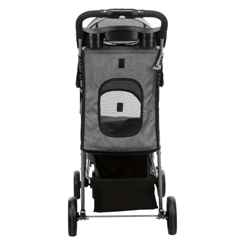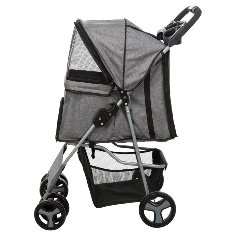 Measurements: 47 × 100 × 80 cm Product Weight: 4.9 kg up to: 15 kg Internal dimensions: 33 × 53 × 55 cm with 4 wheels for more stability with quick-fold function for old, sick, timid or very young dogs and cats one-hand folding system on handle front wheel with 360° joint, spring-mounted with 2 parking brakes large rear door for getting the pet in and out can be partly or fully closed with zips various net inserts, some can be covered with 2 short leashes removable cushion (polyester), removable cover with padded handle, storage compartments and basket metal, polyester cover
