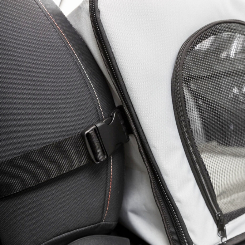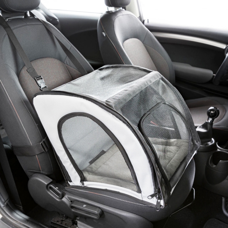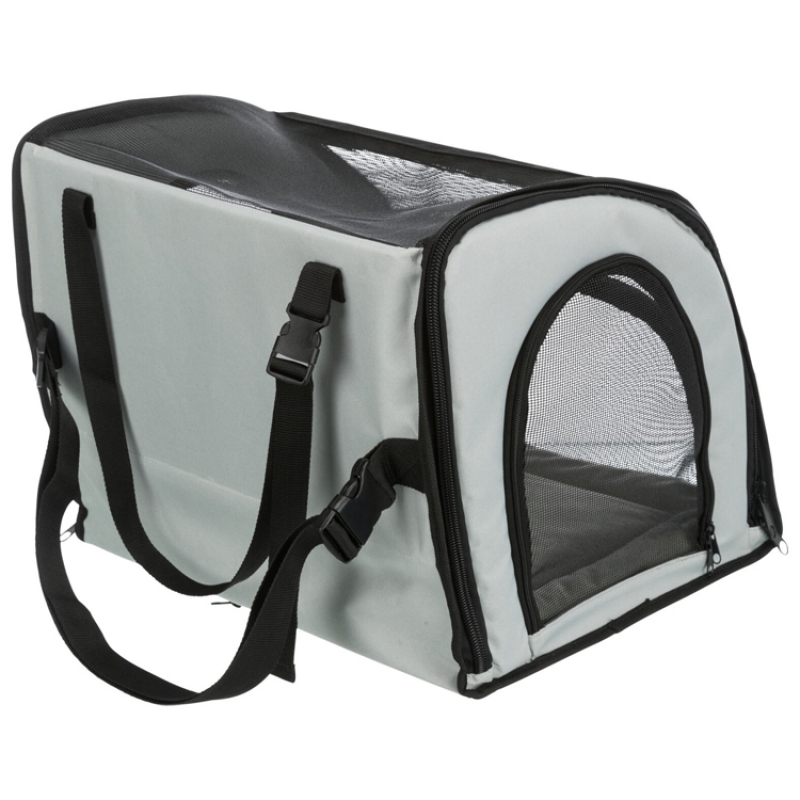 Measurements: 44 × 37 × 40 cm Colour: grey/black can be opened at the front and side with straps to fix the box inside the car belt slit makes it possible to buckle the dog up various net inserts removable cushion with foam padding: washable by hand collapsible polyester