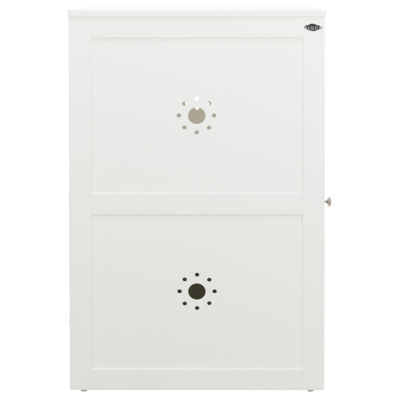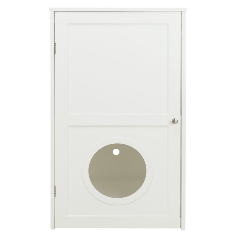 Measurements: 53 × 90 × 58 cm Colour: white MDF, varnished for hiding a cat litter box prevents cat litter being spread with cat litter mat can also be used as sleeping quarters free level can be used as storage space for litter and utensils having the entrance hole at the top makes cleaning the cat litter tray in the upper level easier entrance hole can be placed either at the top or at the bottom the entrance can be installed either on the right or on the left door with magnetic closure fits cat litter mats