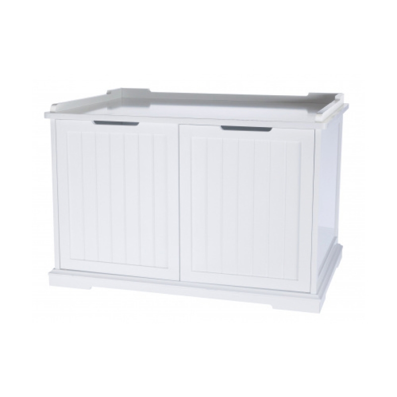 Measurements: 75 × 51 × 53 cm Colour: white MDF, varnished suitable for hiding a cat litter box can also be used as a decorative sleeping place prevents cat litter being spread with cat litter mat the entrance can be installed either on the right or on the left fast and easy cleaning due to to big door at the front doors lock easily with magnetic closure