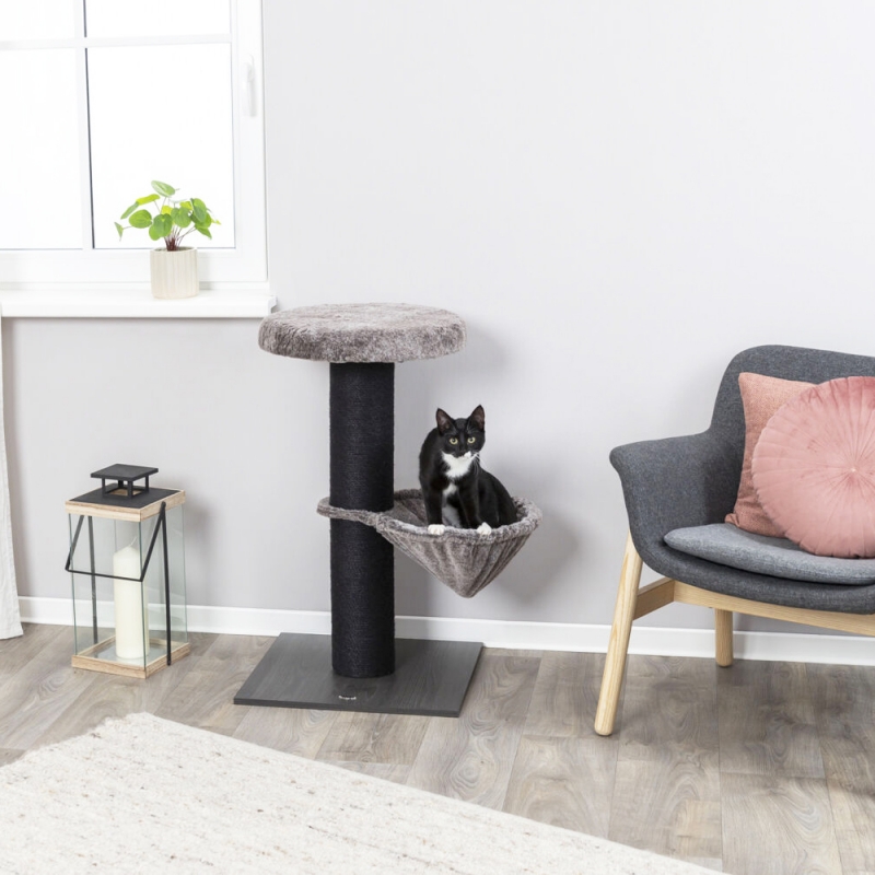 Floor area: 50 × 50 cm Height: 84 cm jute: ø 5 mm/long-haired plush (polyester): 260 g/m² cuddly bed with removable cover: hand wash cuddly bag with sturdy metal frame base plate made of veneered MDF board colour: brown