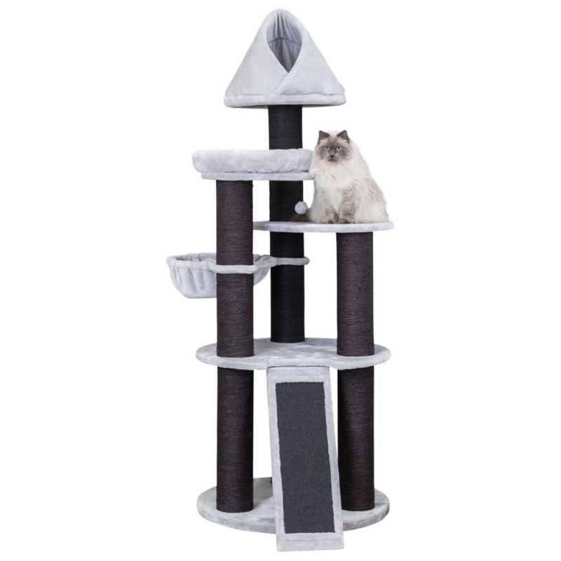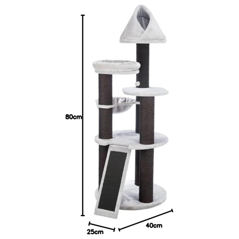 Floor area: 78 × 78 cm Height: 203 cm Especially suitable for large cats sisal: ø 5 mm/plush (polyester): 450 g/m² removable cuddly cave, padded and quilted: washable by hand with removable cuddly bed, padded and quilted: washable by hand sturdy cuddly bag thick, heavy base plate colour: grey