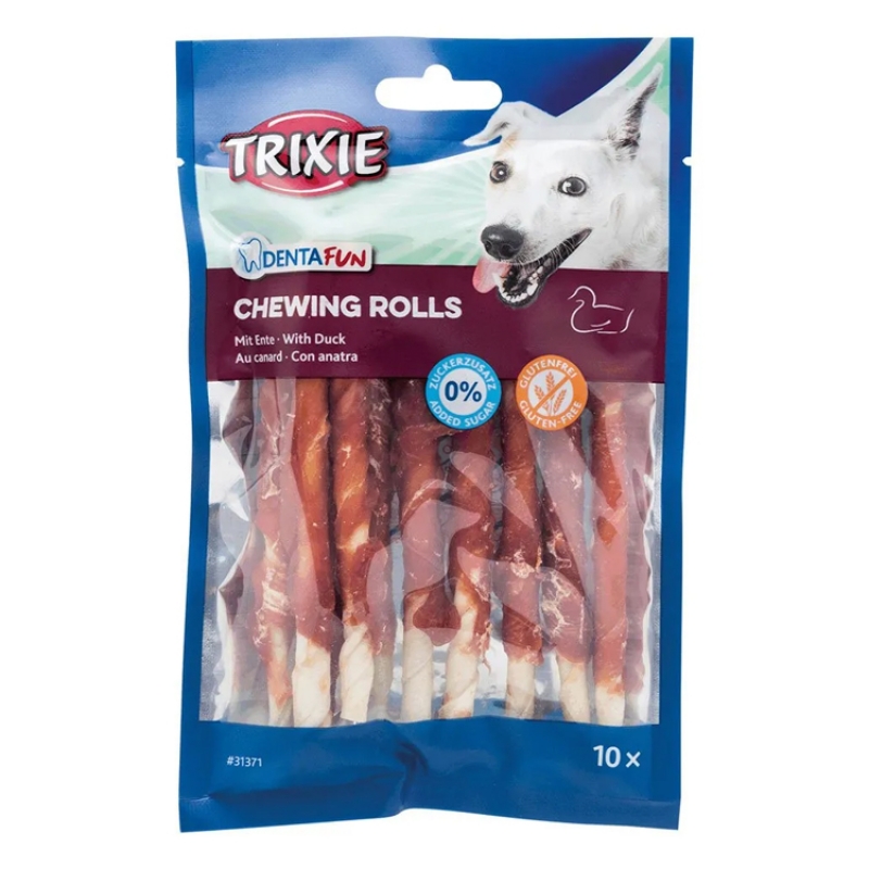 rawhide wrapped in duck meat packaged Measurements: 12 cm, Contents/Weight: 10 pcs./80 g Measurements: 12 cm, Contents/Weight: 30 pcs./240 g Measurements: 17 cm, Contents/Weight: 3 pcs./140 g Measurements: 28 cm, Contents/Weight: 3 pcs./250 g