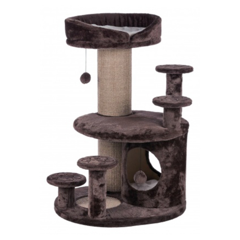 with plush cover posts covered in sisal carpet 4 padded climbing aids with embroidery cave with reversible cushion reversible cushion: washable by hand with sisal scratching area padded platforms platform with removable cuddly bed cuddly bed with reversible cushion: washable by hand with toys on string colour: brown/beige