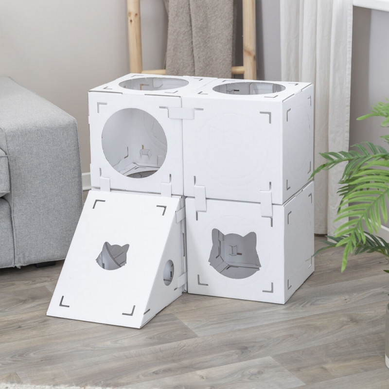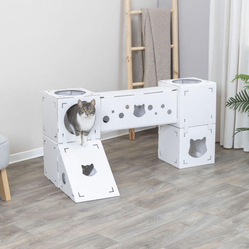 Measurements: 125 × 62 × 62 cm Flexible & creating variety suitable for cats up to 8 kg set includes: 4 cubes, 1 tunnel, 1 ramp made of 100 % recycled cardboard All our cat tree models have various scratching surfaces made of sisal or jute. Sisal and jute are particularly suitable for claw care, as these materials are sufficiently rough to remove the worn down layers of claws. They love to sharpen their claws on suitable surfaces. It is also important to groom their claws so that they can shed the worn-down sheaths of the claws, exposing the constantly regrooming claws.