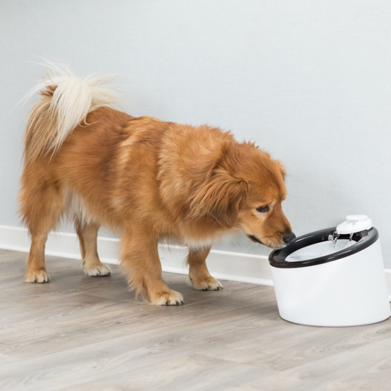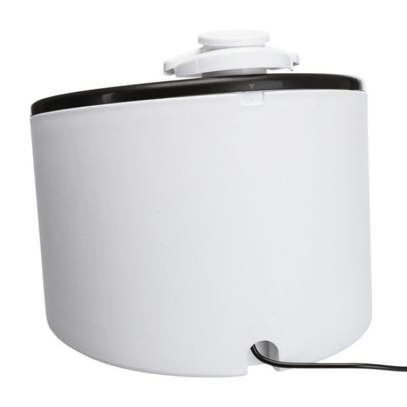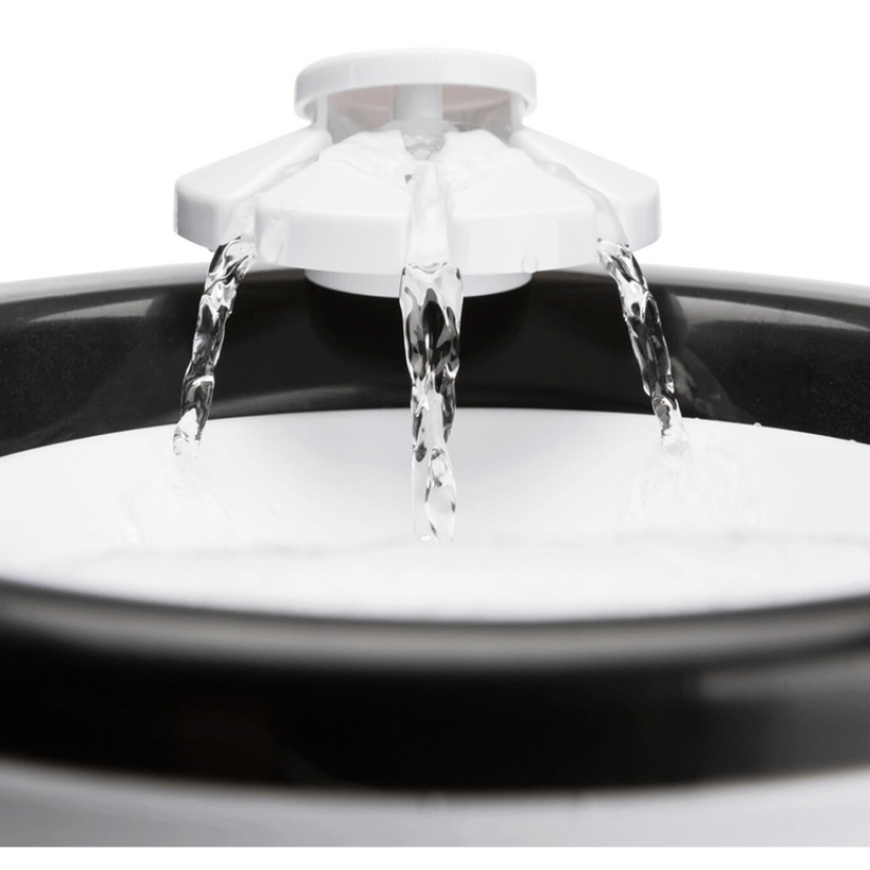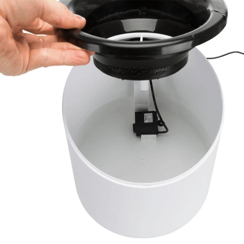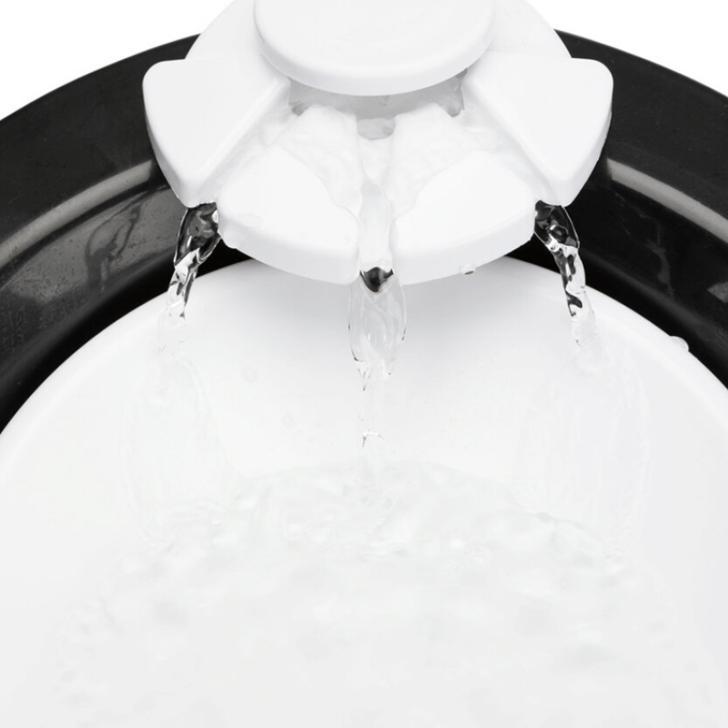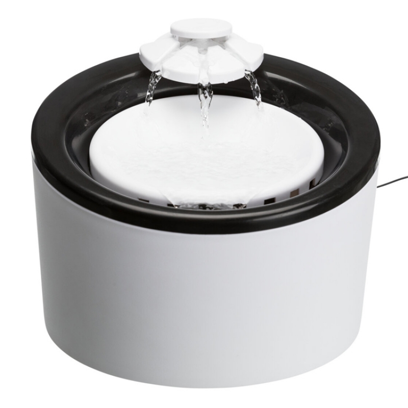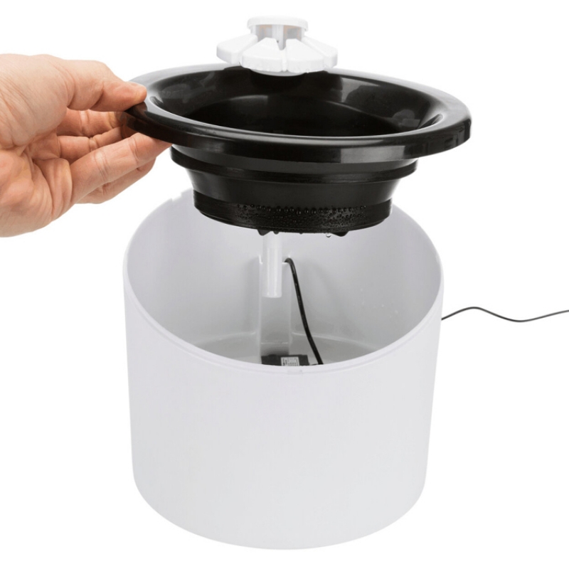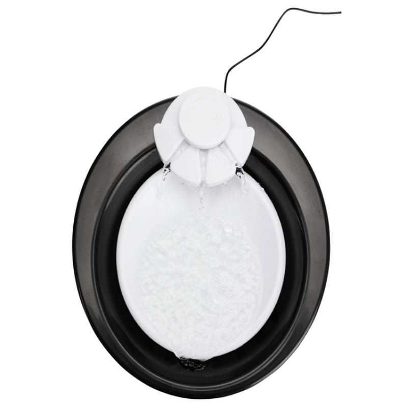 Measurements: 2 l/ø 22 × 18 cm Height: 18 cm Colour: black/white flowing water or still water can be drunk from the bowl water inflow can be regulated enriches the water with oxygen cold water through circulation active carbon filter ensures an improved water quality pump with automatic stop, exchangeable