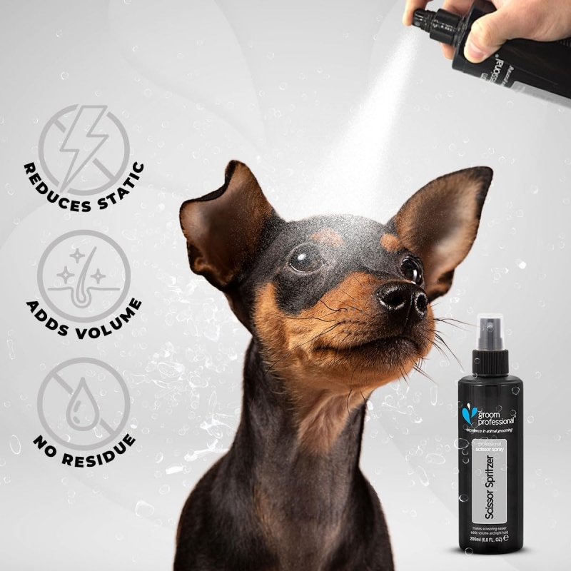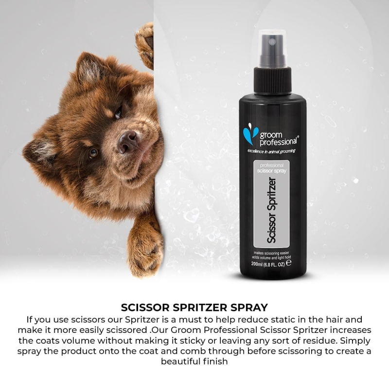 200 ml Reduces Static Holds and adds Volume Won't leave any residue Groom Professional Scissor Spirtzer is one of our most eagerly awaited products. During trails every one of the groomers and exhibitors who received a sample, all rated the product as excellent. If you use scissors then Scissor Spritzer is a must to reduce static, leave the hair easier scissored, as well as the comb gliding easily through the coat. Scissor Spritzer holds and adds volume the coat without making it sticky or leaving any residue. Simply spray on and comb in before scissoring to leave a beautiful finish.