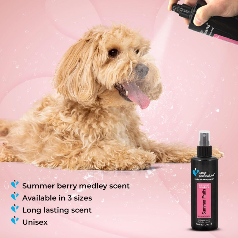 500 ml This gorgeous, Summer Fruit scented cologne will bring back memories of fun in the sun! This fragrance opens with top notes of blackberry, blackcurrant, bergamot and green fruits, resting on a heart of soft plum, creamy peach, strawberry and violet. All resting on a base of ripe raspberry. Suitable for male and female dogs and cats. Scent will last for days.