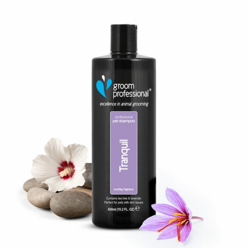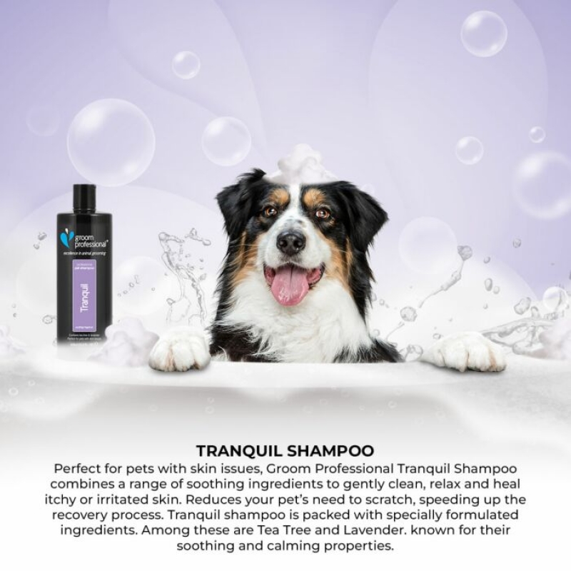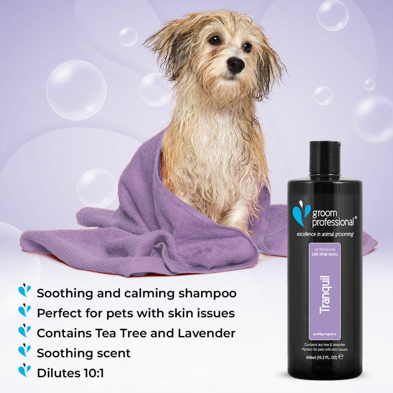 450 ml Tranquil Shampoo is a rich, luxurious formula containing a blend of tea tree and lavender. This blend of ingredients will not only create a sense of calm in the salon, it will also help condition the coat and skin. Contains lavender which is known for its soothing properties while tea tree is renowned for its cooling and soothing properties to help relieve itching. Also acts as an excellent deodorising shampoo. This shampoo is perfect for dogs with skin issues, smelly coats or who are nervous or excited. Tea tree and lavender blend Soothing and calming Relieves itching Deodorizing