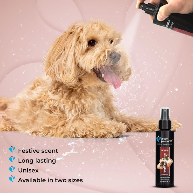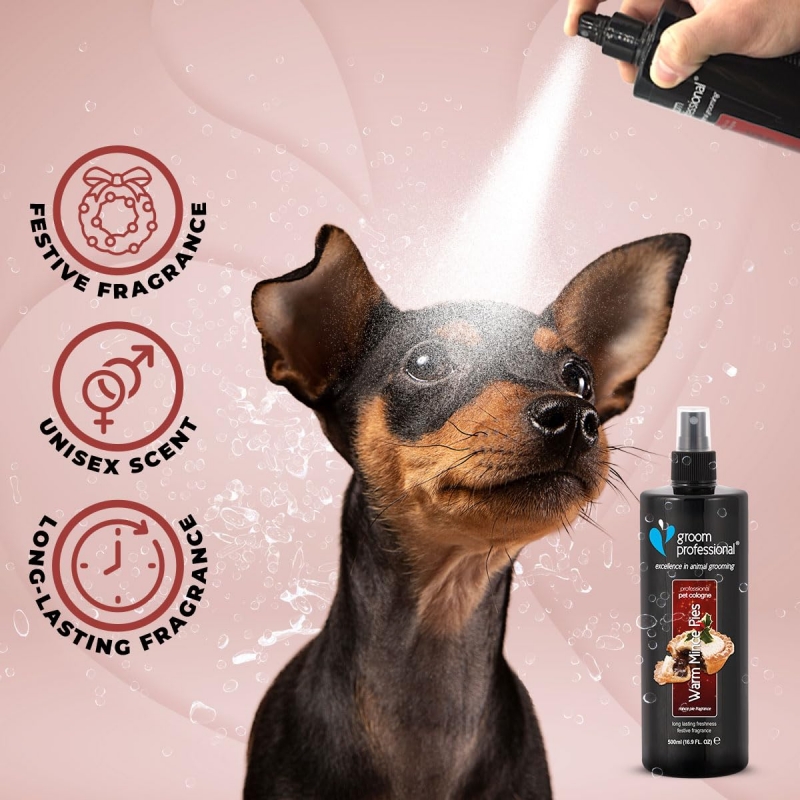 500 ml A true festive scent for your pet and clients! Features the warm, festive scents of raisins, sultanas, brown sugar, cinnamon, nutmeg and a dash of fine brandy. Simply spray onto a dry coat between baths for instant freshness - or use after the Warm Mince Pies Shampoo for a super-seasonal treat! Scent will last on the coat for days. To Use: Simply spray once or twice on the back of the neck to leave the dog & cat smelling great for days.