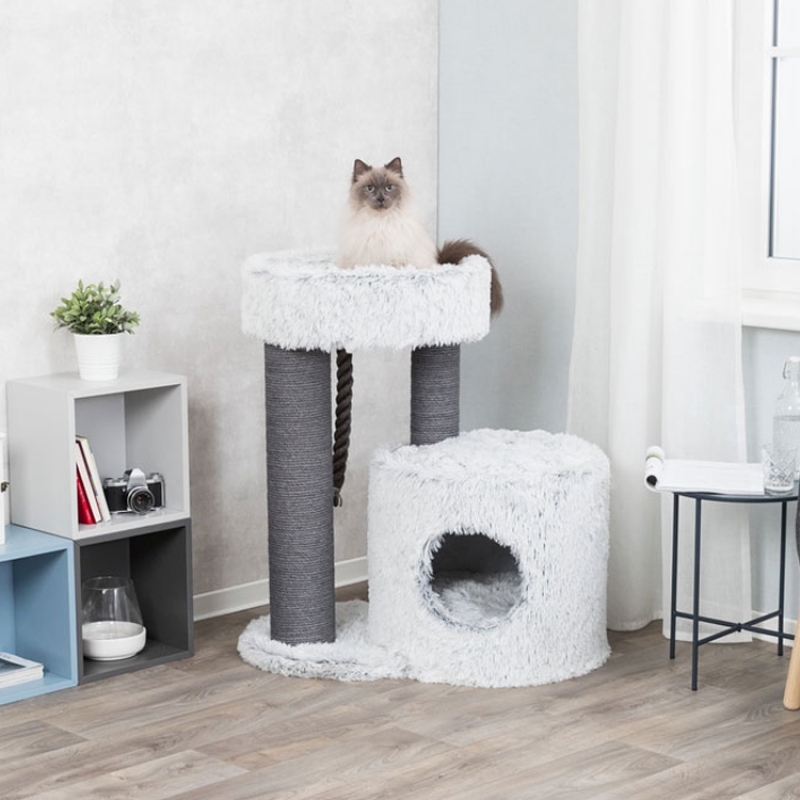 Floor area: 86 × 54 cm Post: ø 15 cm Colour: grey Height: 96 cm Especially suitable for large cats jute: ø 6 mm/plush (polyester) cave fitted with fleece (polyester) cuddly bed with padded rim 3 reversible cushions: washable by hand thick, heavy base plate colour: grey