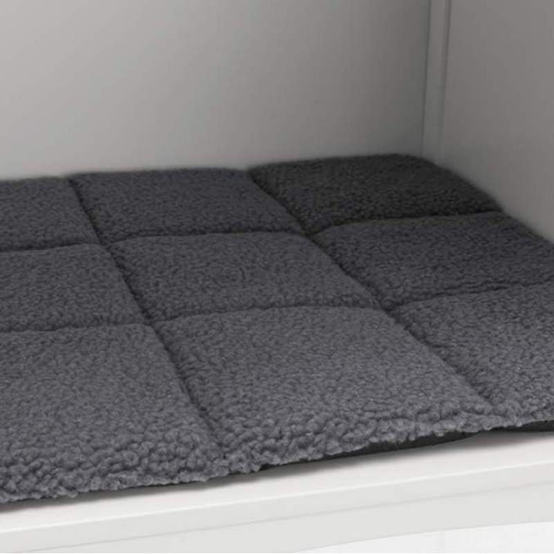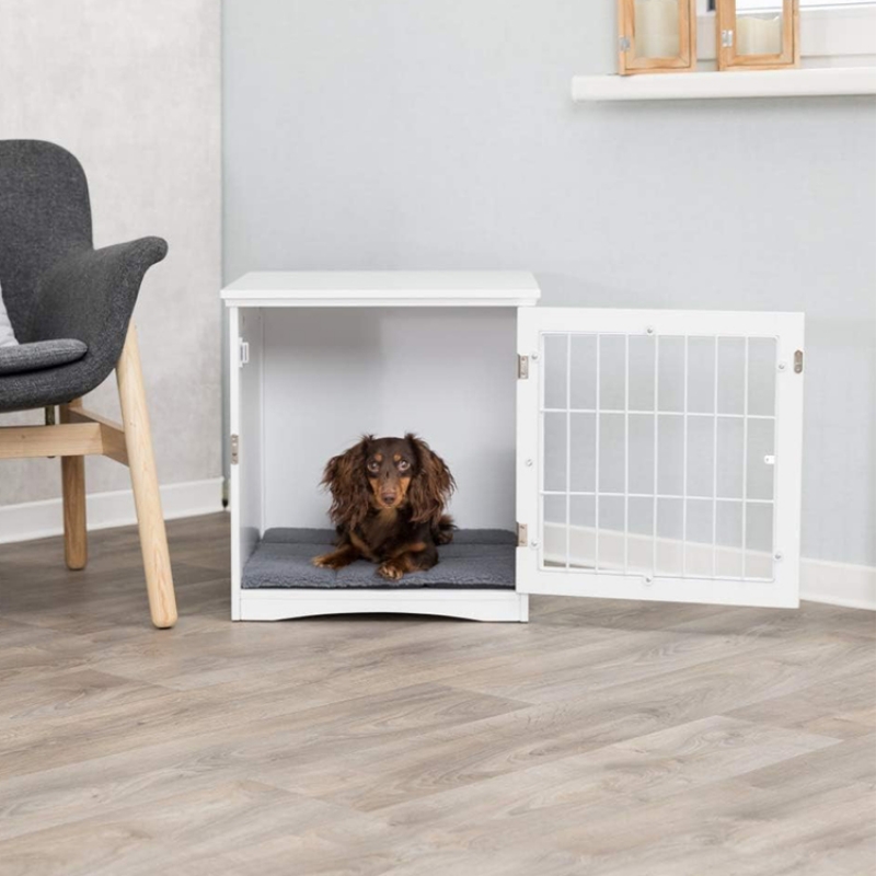 Measurements: 48 × 51 × 51 cm Height: 51 cm Colour: white ideal for short-term placing at home offers a retreat option opens from the front with metal grid and latch cuddly insert in lamb fur look (polyester) with foam filling and non-slip bottom, hand wash simply wipe clean MDF, varnished