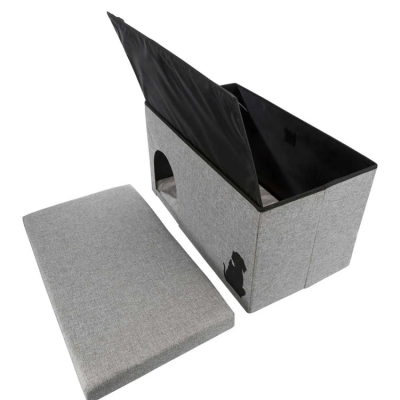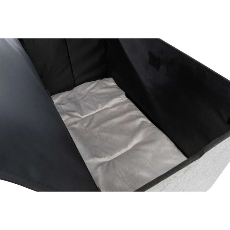 Measurements: 72 × 40 × 40 cm Height: 40 cm Colour: light grey with storage compartment woven fabric (polyester) for small dogs and for large cats collapsible with removable, padded lid and storage compartment cave can be completely opened from above thanks to hook and loop fasteners at base of storage compartment reversible cushion with plush cover (polyester): machine wash 40 °C gentle