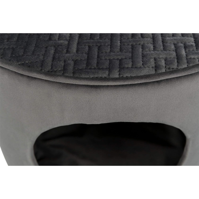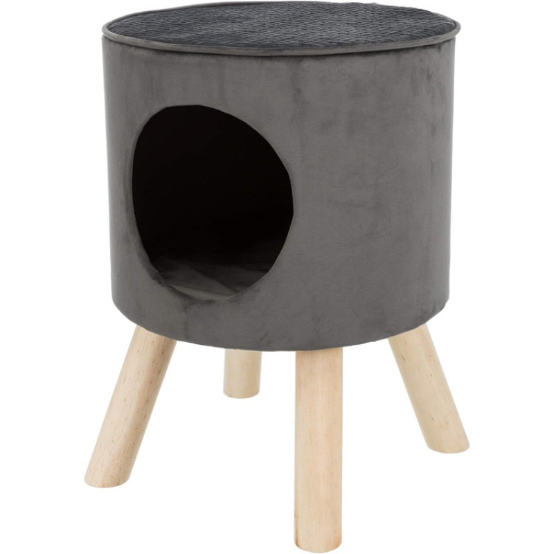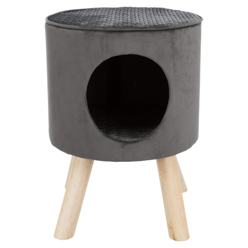 Measurements: ø 38 × 50 cm Height: 50 cm Colour: dark grey velvet look polyester cover with place on the roof for observation padded platform reversible cushion with two design versions and polyester fleece filling, washable by hand with wooden feet up to 40 kg